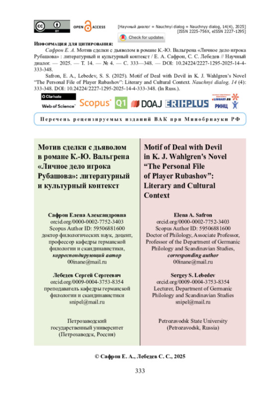 Проведено исследование особенностей репрезентации мотива сделки с дьяволом в романе К. Ю. Вальгрена «Личное дело игрока Рубашова» (1996). Актуальность исследования обусловлена возможностью по-новому взглянуть на русскую классическую литературу XIX века глазами современного шведского писателя — носителя другой культуры. Научная новизна состоит в том, что на материале этого романа впервые показано, как мотив сделки с дьяволом помогает объединить разнородные элементы культурно-исторического контекста в рамках постмодернистского текста. В качестве материалов для проведения интертекстуального анализа интерпретации К. Ю. Вальгреном мотива сделки с дьяволом привлекаются произведения И. В. Гете, А. С. Пушкина, Н. В. Гоголя, М. Ю. Лермонтова, Ф. М. Достоевского, О. де Бальзака. Доказано, что К. Ю. Вальгрен использует в романе театральные приемы, синтезируя высокий жанр (трагедию) и низкий (комедию). Подчеркивается, что мотив сделки с дьяволом является катализатором фабулы и удобным инструментом для игры с элементами мифологии и фольклора в контексте постмодернизма XX века. Авторы утверждают, что писатель постулирует идею гуманизма: герой, наказанный бессмертием, но сохранивший, несмотря ни на какие испытания, доброту и возможность сострадать, находит успокоение.