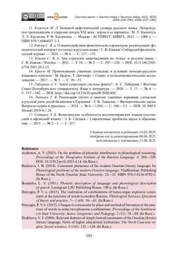 11. Князев С. В. а. О взаимодействии фонетических параметров, реализующих фонологический контраст по голосу в русском языке / С. В. Князев// Сибирский филологический журнал. - 2021. - № 4. - С. 137-153.