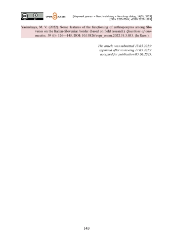 12. Ясинская М. В. Некоторые особенности функционирования антропонимов у словенцев на итальянско-словенском пограничье (на материале полевых исследований) / М. В. Ясинская // Вопросы ономастики. - 2022. - Т. 19. - № 3. - С. 126- 145. - https://doi.org/10.15826/vopr_onom.2022.19.3.033.