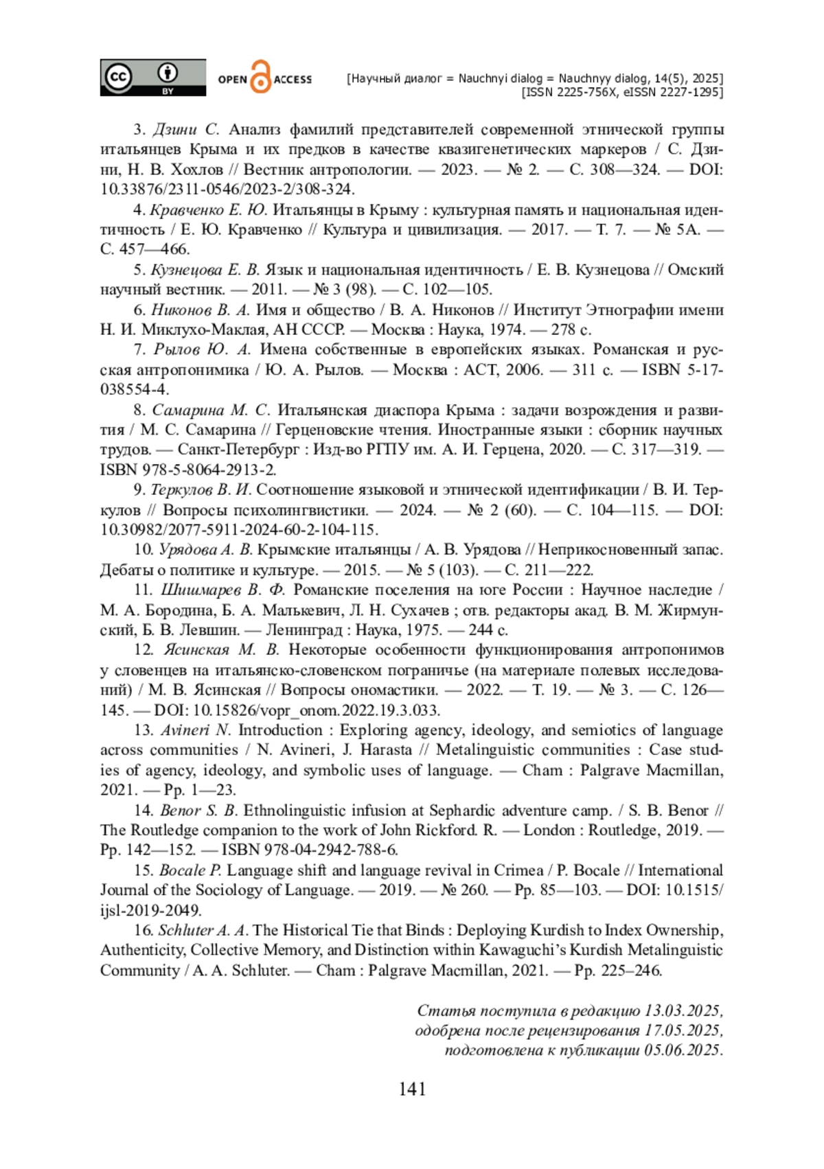 3. Дзини С. Анализ фамилий представителей современной этнической группы итальянцев Крыма и их предков в качестве квазигенетических маркеров / С. Дзини, Н. В. Хохлов // Вестник антропологии. - 2023. - № 2. - С. 308-324. - https://doi.org/10.33876/2311-0546/2023-2/308-324.