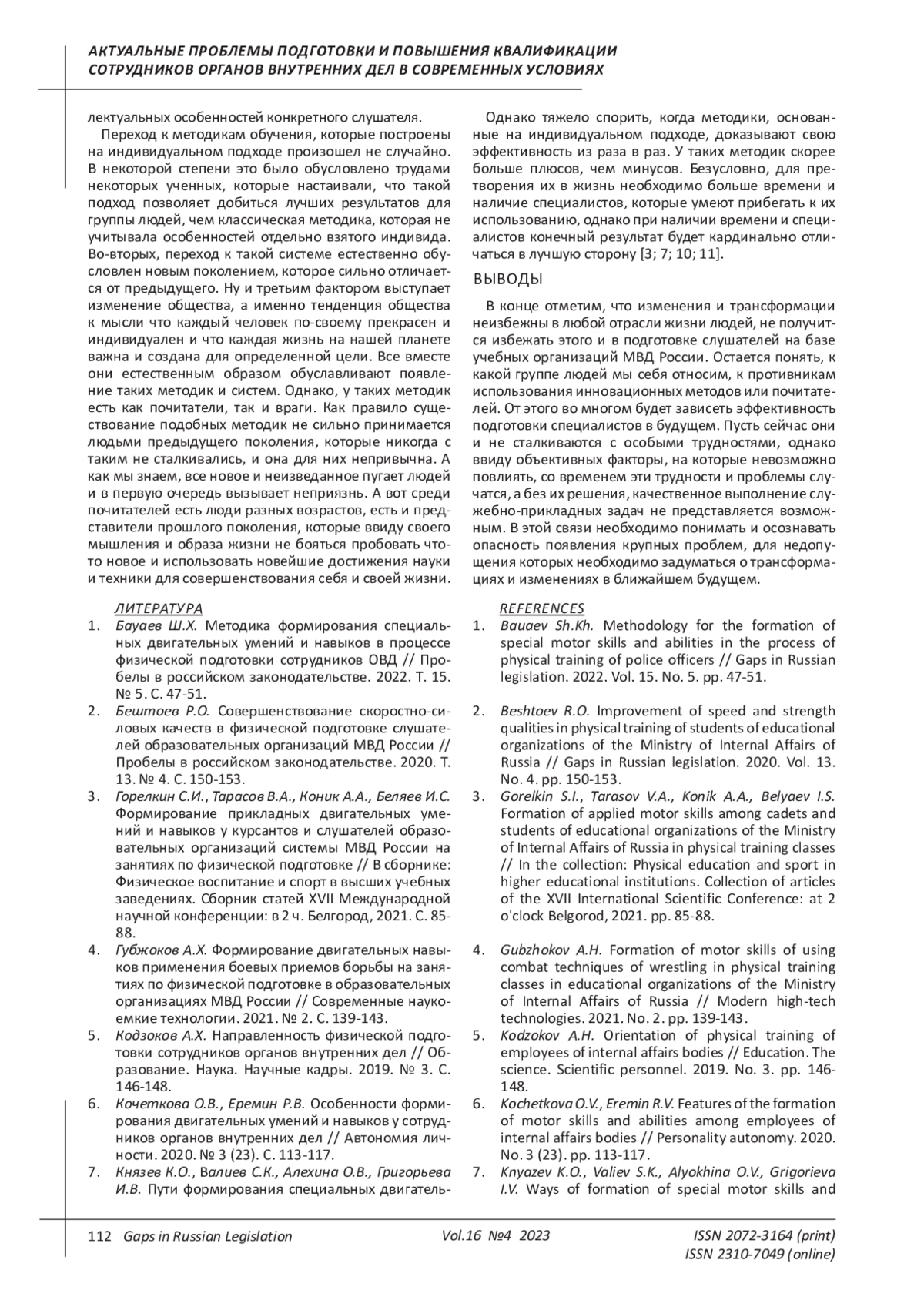 1. Бауаев Ш.Х. Методика формирования специальных двигательных умений и навыков в процессе физической подготовки сотрудников ОВД // Пробелы в российском законодательстве. 2022. Т. 15. № 5. С. 47-51. EDN: JGEAJT