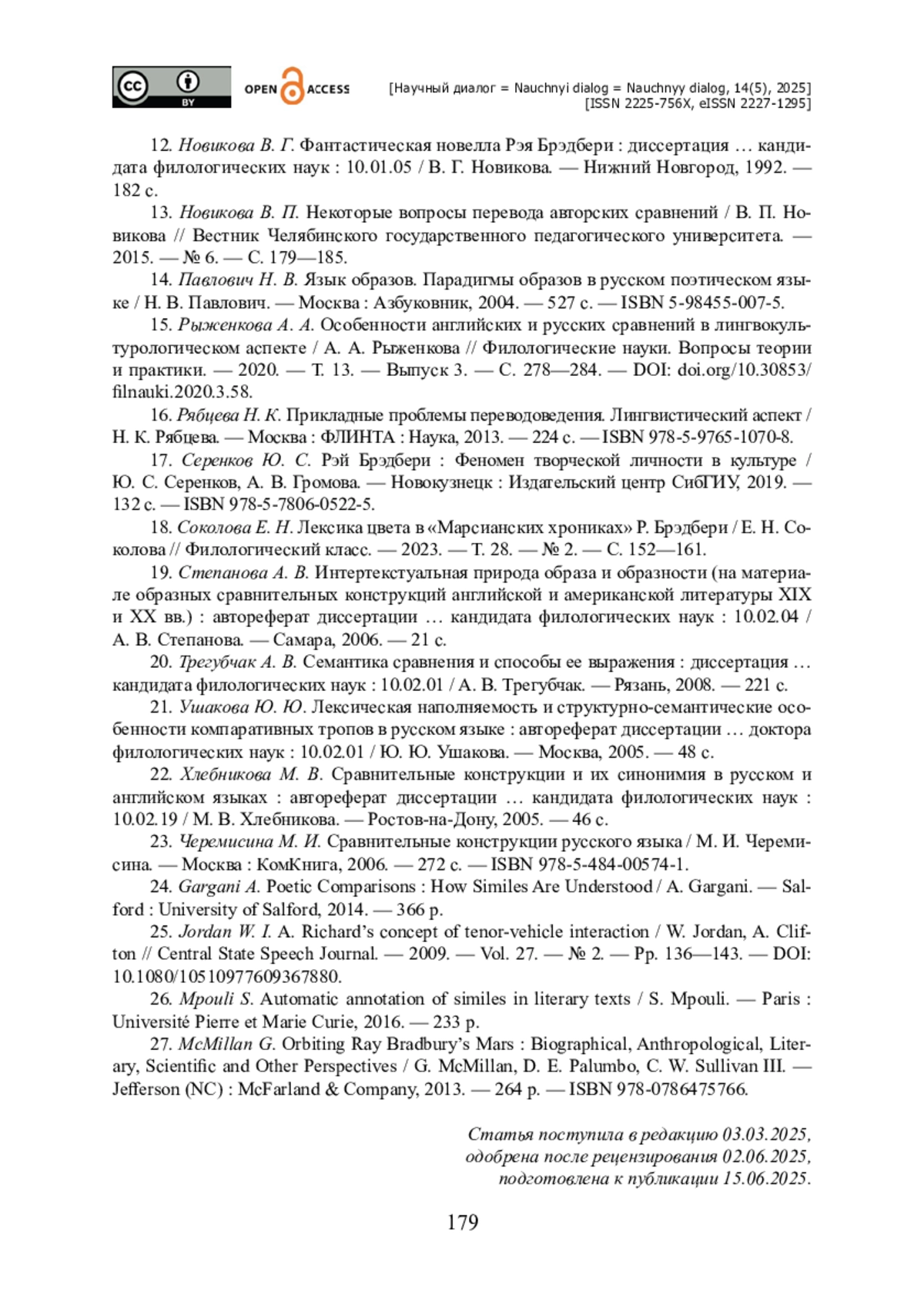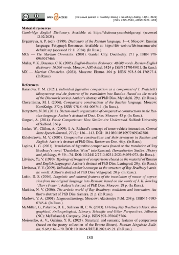 5. Лапина Л. Г. Перевод образных сравнений (на материале перевода повести Рэя Брэдбери «Вино из одуванчиков» на русский язык) / Л. Г. Лапина // Гуманитарные исследования. История и филология. - 2023. - № 9. - С. 59-74. - https://doi.org/10.24412/2713-0231-2023-9-059-073.