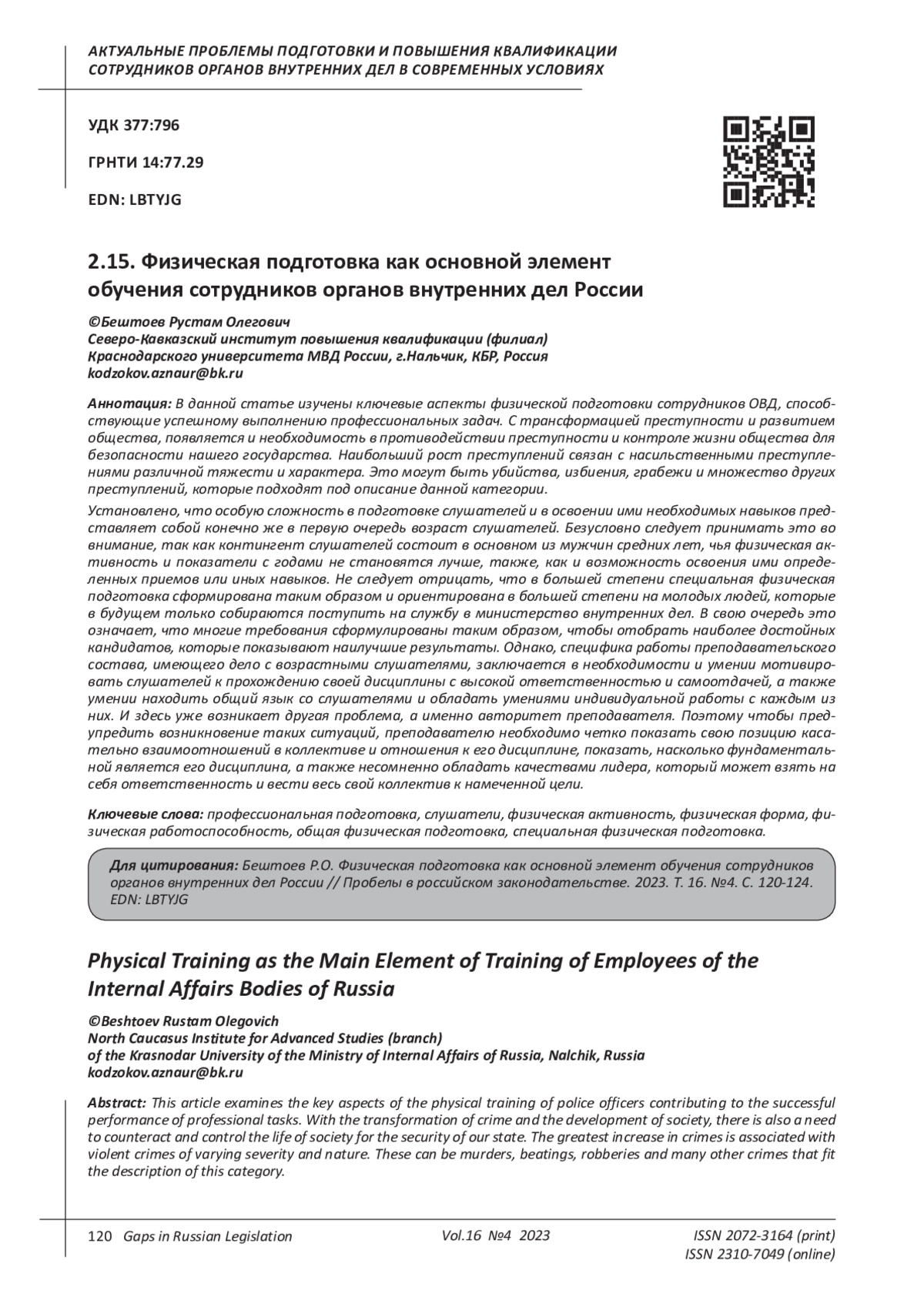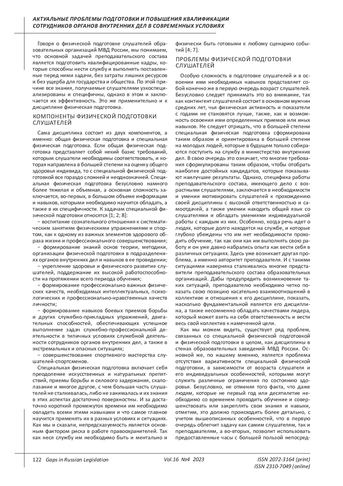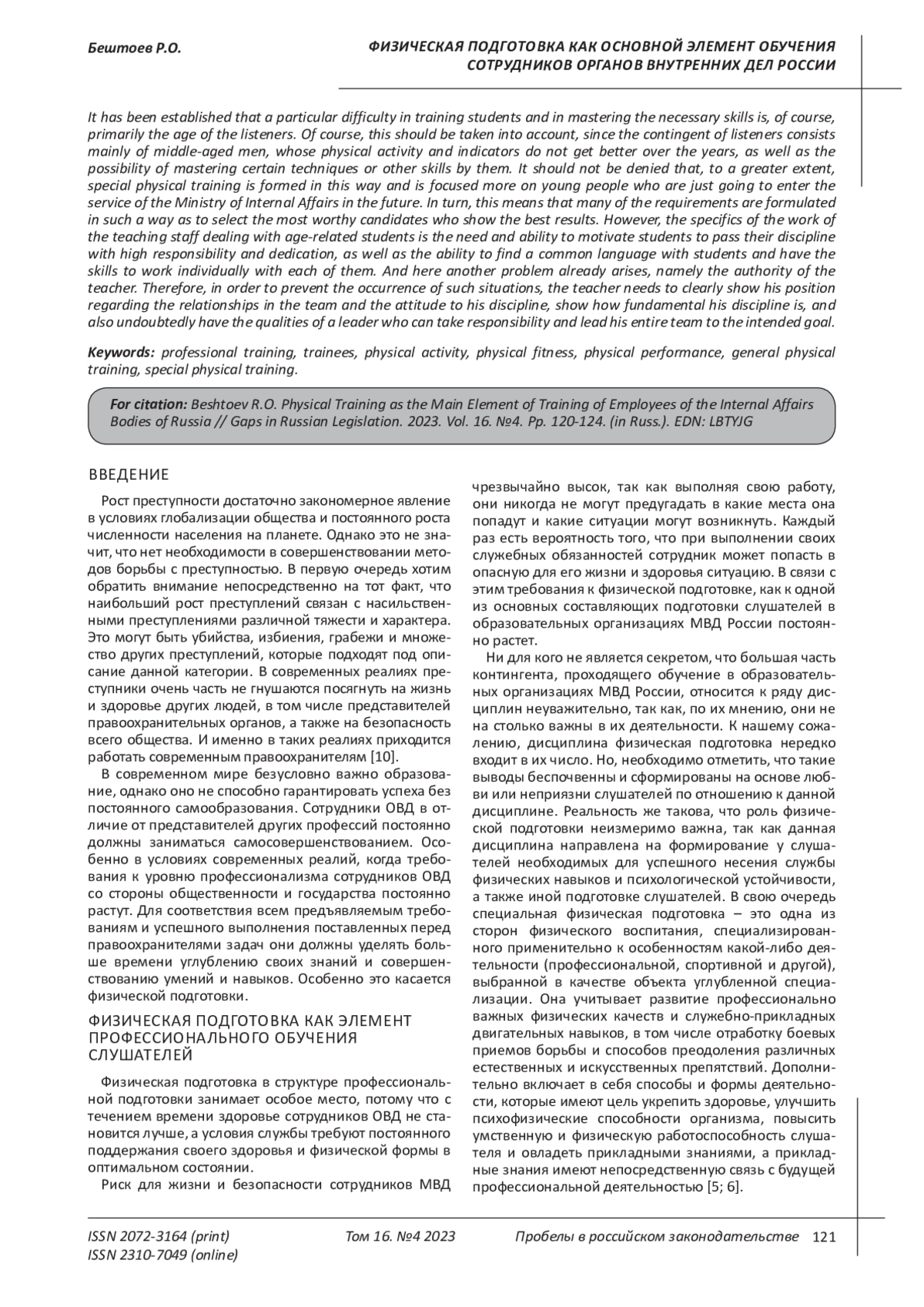 БЕШТОЕВ Р. О. ФИЗИЧЕСКАЯ ПОДГОТОВКА КАК ОСНОВНОЙ ЭЛЕМЕНТ ОБУЧЕНИЯ СОТРУДНИКОВ ОРГАНОВ ВНУТРЕННИХ ДЕЛ РОССИИ // ПРОБЕЛЫ В РОССИЙСКОМ ЗАКОНОДАТЕЛЬСТВЕ. 2023. Т. 16 № 4