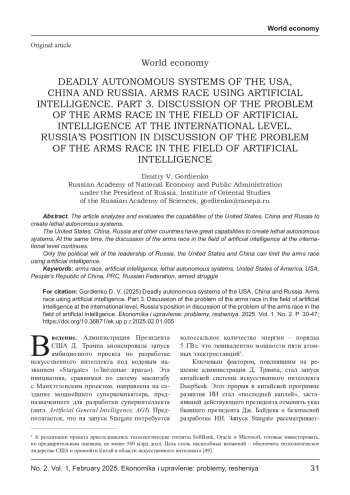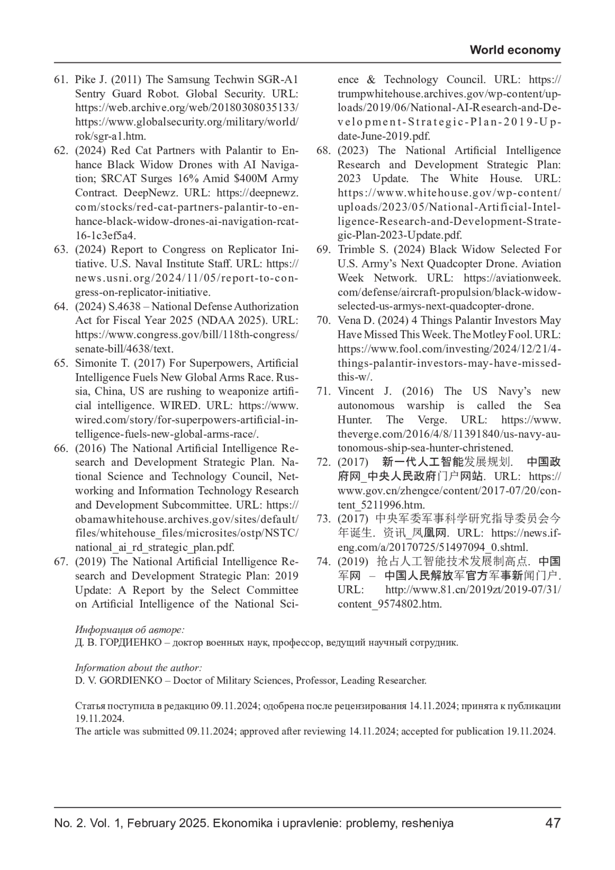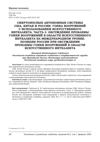 13. Гордиенко Д. В. Смертоносные автономные системы США, Китая и России. Гонка вооружений с использованием искусственного интеллекта (Часть 1. Разработка смертоносных автономных систем вооружения США) // Экономика и управление: проблемы, решения. 2025. Т. 1 (154), № 1. С. 84-101.