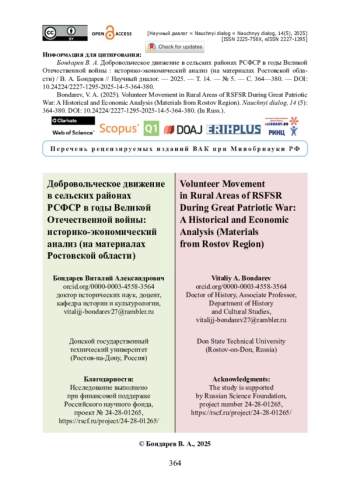 Статья: Добровольческое движение в сельских районах РСФСР в годы Великой Отечественной войны: историко-экономический анализ (на материалах Ростовской области) (2025)