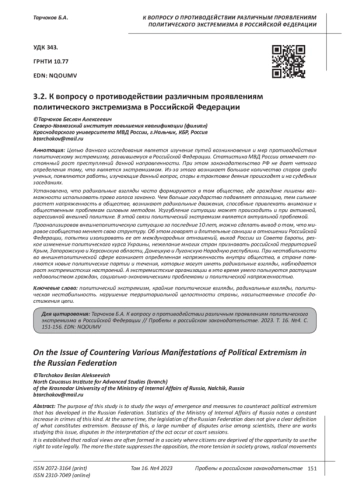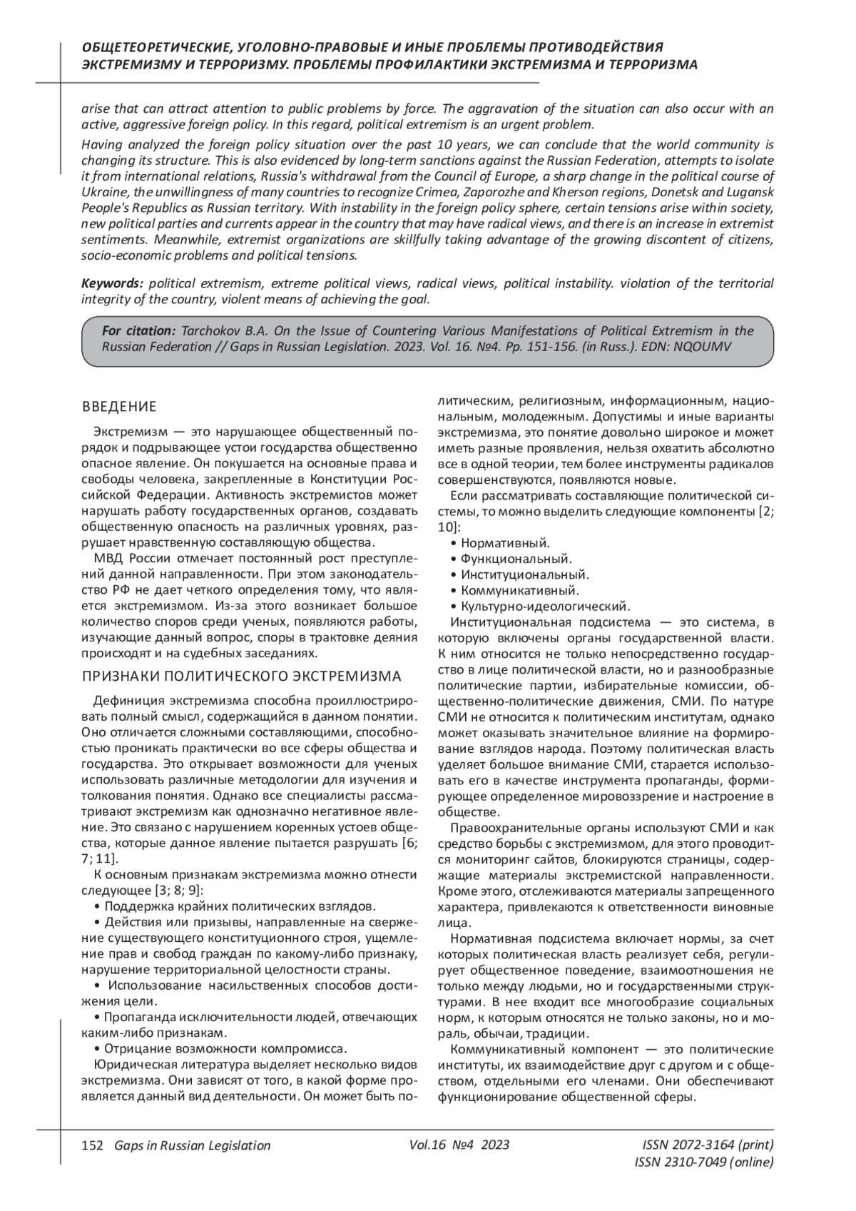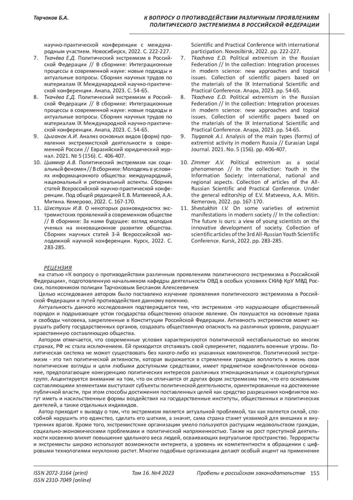 9. Цыганок А.И. Анализ основных видов (форм) проявления экстремистской деятельности в современной России // Евразийский юридический журнал. 2021. № 5 (156). С. 406-407. EDN: EACCDO