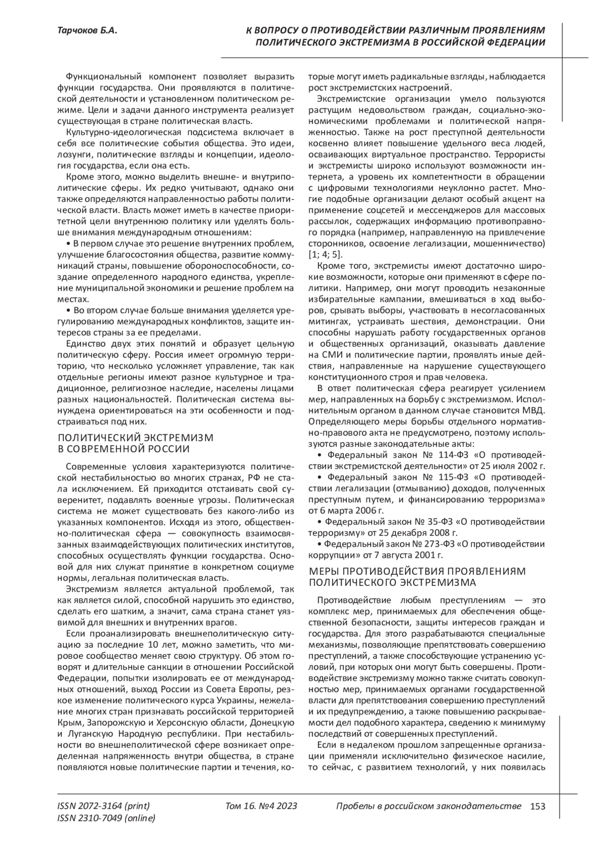 4. Майстренко Г.А. Противодействие политическому экстремизму: современные тенденции // Теории и проблемы политических исследований. 2021. Т. 10. № 1A. С. 16-23. EDN: HOAHSE