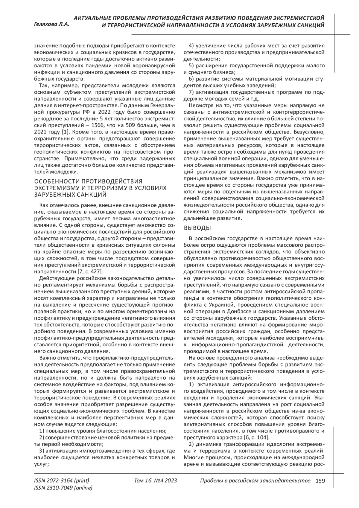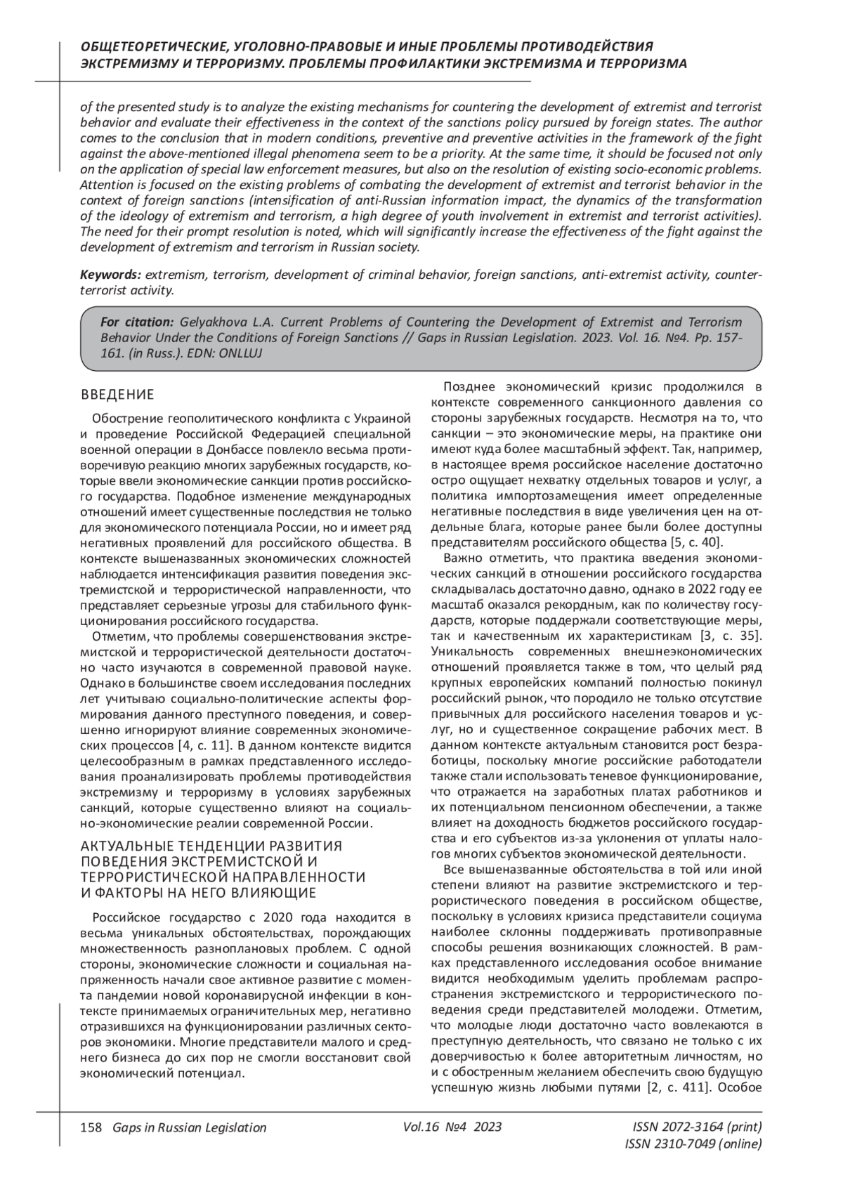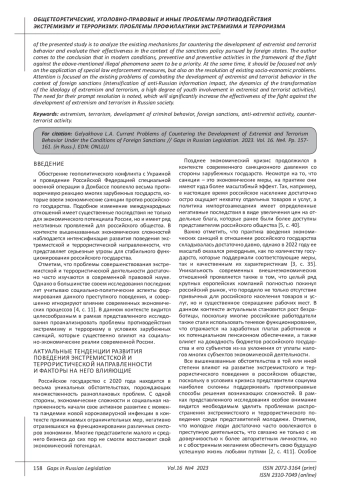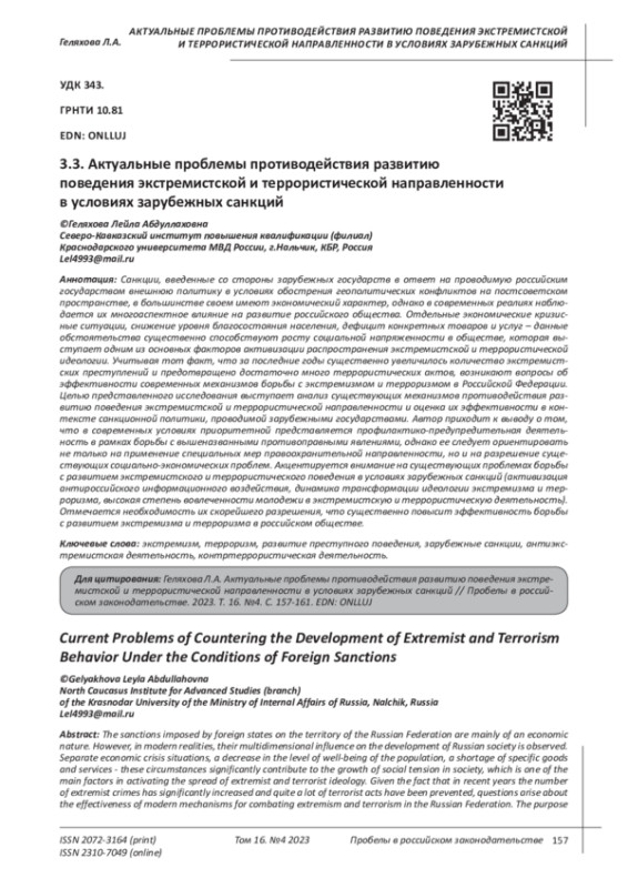 Санкции, введенные со стороны зарубежных государств в ответ на проводимую российским государством внешнюю политику в условиях обострения геополитических конфликтов на постсоветском пространстве, в большинстве своем имеют экономический характер, однако в современных реалиях наблюдается их многоаспектное влияние на развитие российского общества. Отдельные экономические кризисные ситуации, снижение уровня благосостояния населения, дефицит конкретных товаров и услуг - данные обстоятельства существенно способствуют росту социальной напряженности в обществе, которая выступает одним из основных факторов активизации распространения экстремистской и террористической идеологии. Учитывая тот факт, что за последние годы существенно увеличилось количество экстремистских преступлений и предотвращено достаточно много террористических актов, возникают вопросы об эффективности современных механизмов борьбы с экстремизмом и терроризмом в Российской Федерации. Целью представленного исследования выступает анализ существующих механизмов противодействия развитию поведения экстремистской и террористической направленности и оценка их эффективности в контексте санкционной политики, проводимой зарубежными государствами. Автор приходит к выводу о том, что в современных условиях приоритетной представляется профилактико-предупредительная деятельность в рамках борьбы с вышеназванными противоправными явлениями, однако ее следует ориентировать не только на применение специальных мер правоохранительной направленности, но и на разрешение существующих социально-экономических проблем. Акцентируется внимание на существующих проблемах борьбы с развитием экстремистского и террористического поведения в условиях зарубежных санкций (активизация антироссийского информационного воздействия, динамика трансформации идеологии экстремизма и терроризма, высокая степень вовлеченности молодежи в экстремистскую и террористическую деятельность). Отмечается необходимость их скорейшего разрешения, что существенно повысит эффективность борьбы с развитием экстремизма и терроризма в российском обществе.