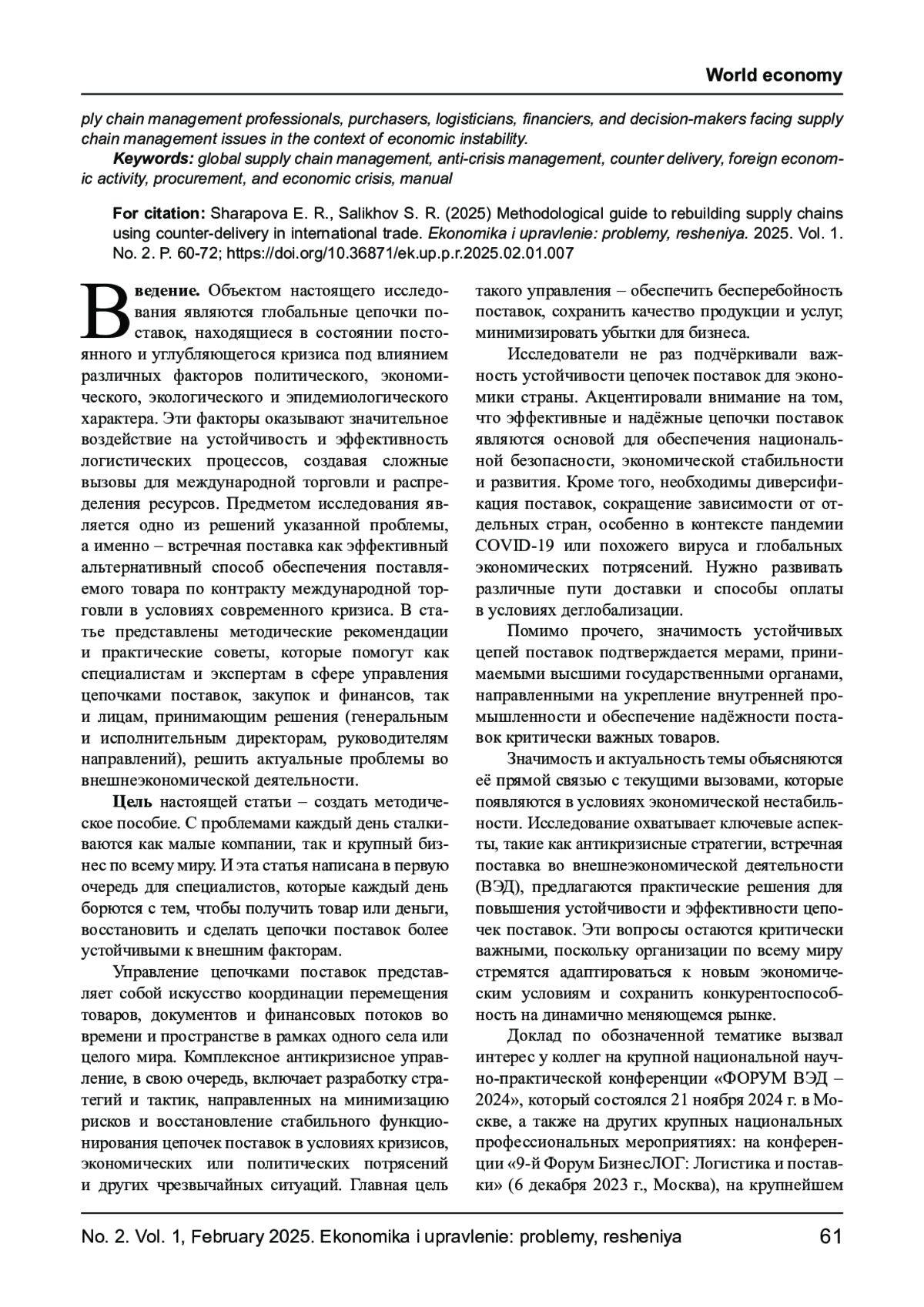 В настоящей статье исследуется проблема устойчивости цепочек поставок в условиях глобальных кризисов, связанных как с экономический, так и с эпидемиологической ситуацией. Основное внимание уделяется встречной поставке как способу получения товаров по контрактам внешней торговли. В статье предлагаются конкретные шаги и рекомендации для специалистов по управлению цепочками поставок, закупщиков, логистов, финансистов, а также лиц, принимающих решения, сталкивающихся с проблемами в управлении поставками в условиях экономической нестабильности.