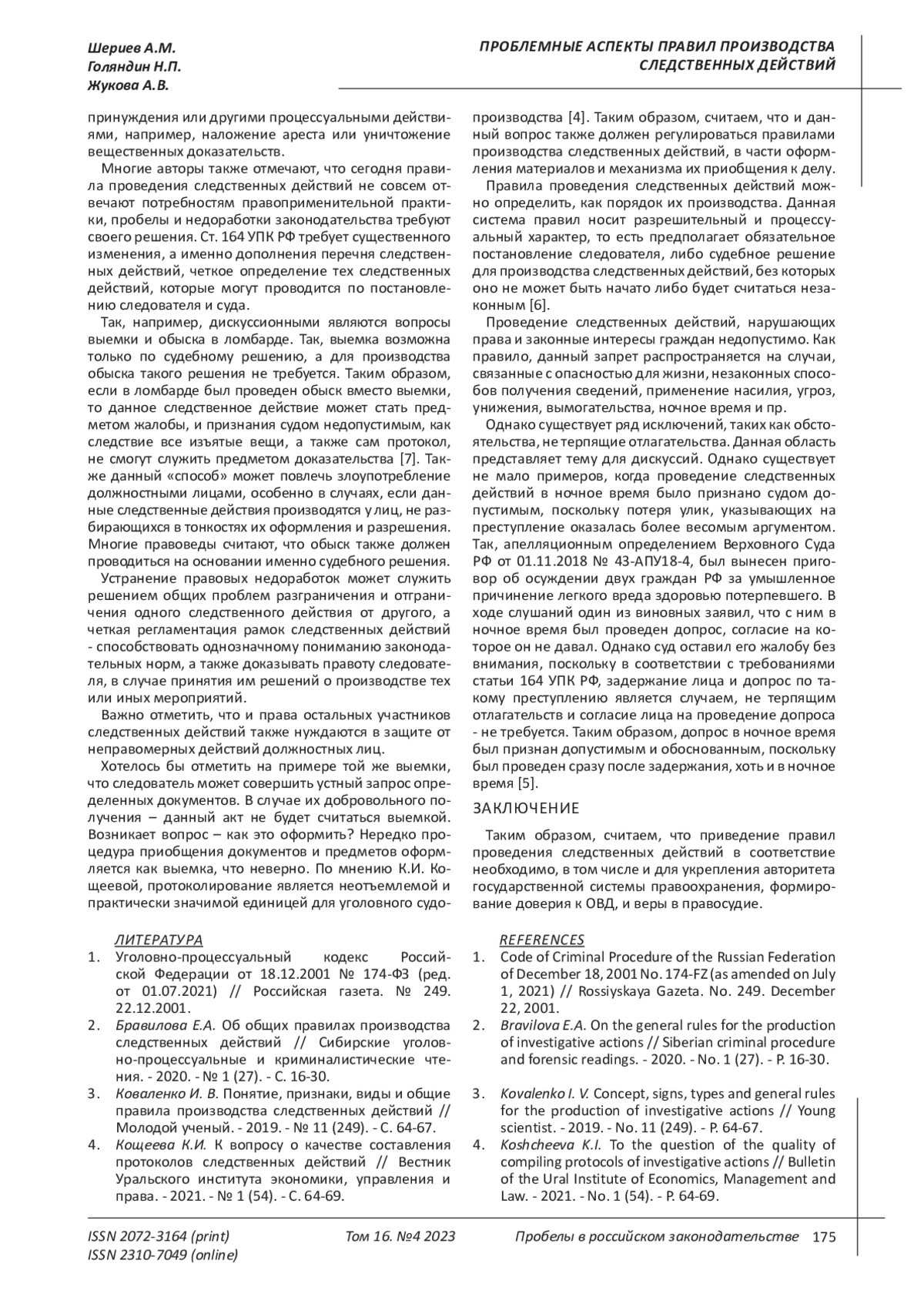 ШЕРИЕВ А. М., ЖУКОВА А. В., ГОЛЯНДИН Н. П. ПРОБЛЕМНЫЕ АСПЕКТЫ ПРАВИЛ ПРОИЗВОДСТВА СЛЕДСТВЕННЫХ ДЕЙСТВИЙ // ПРОБЕЛЫ В РОССИЙСКОМ ЗАКОНОДАТЕЛЬСТВЕ. 2023. Т. 16 № 4