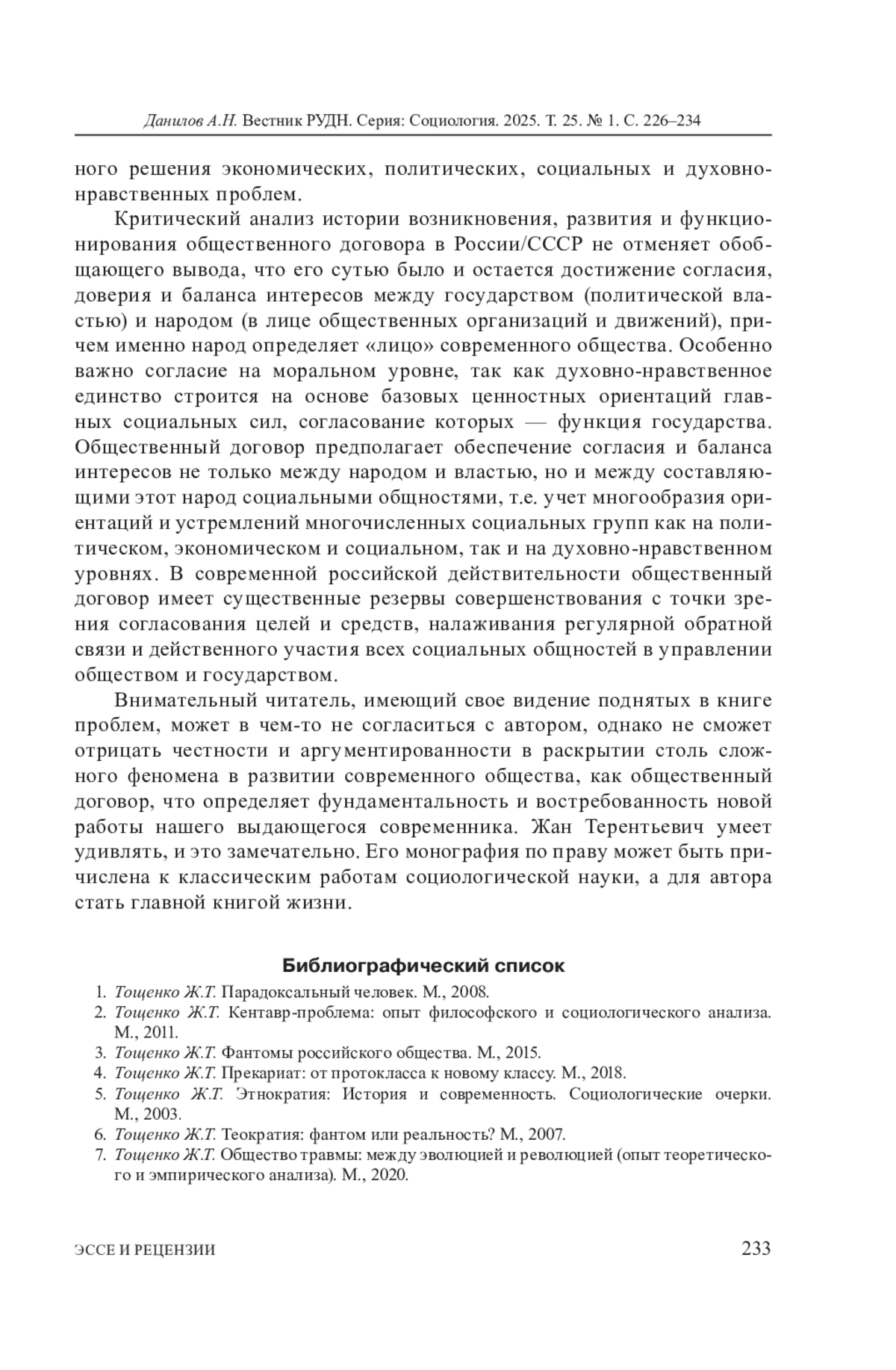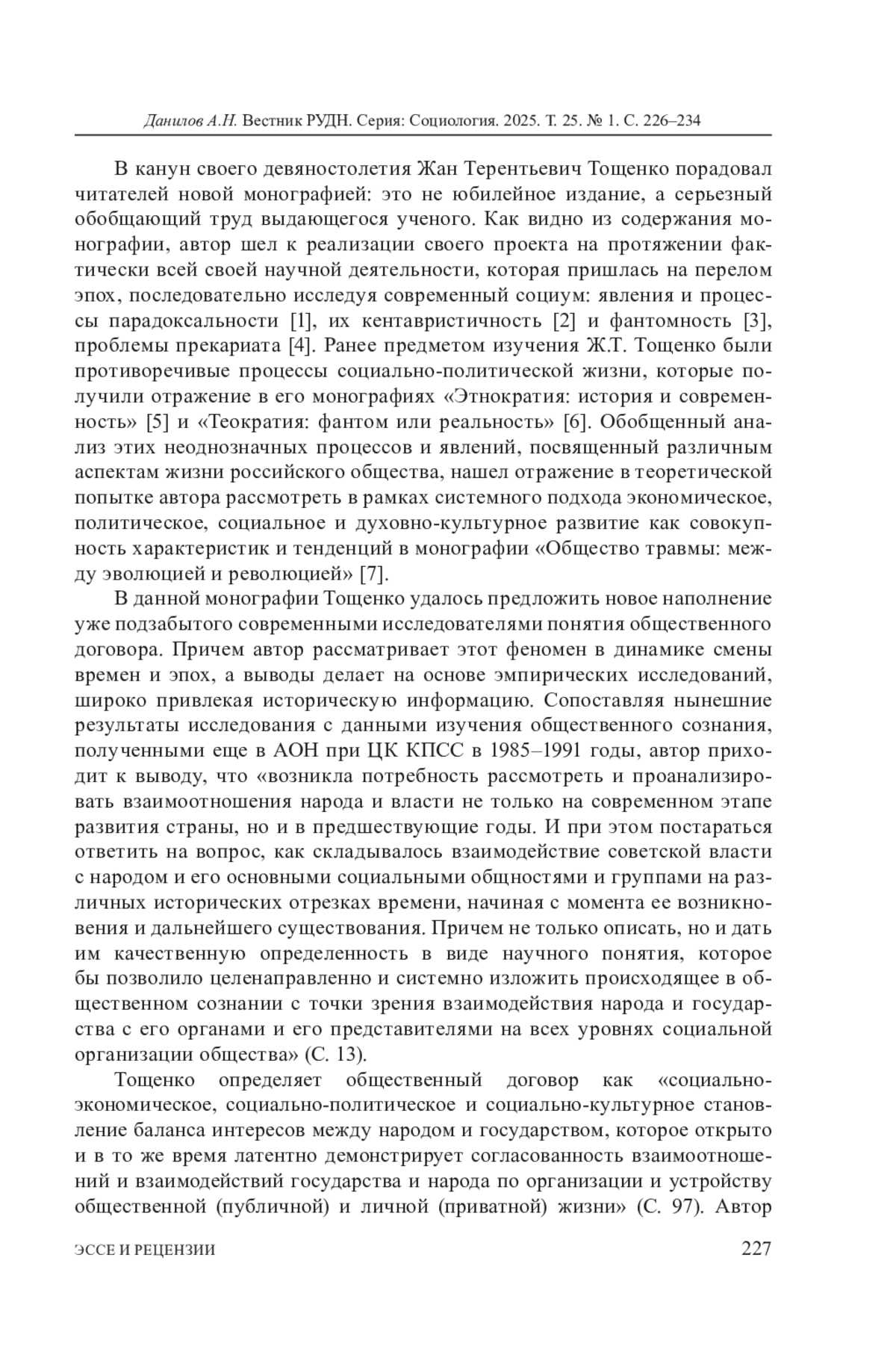 Статья представляет собой рецензию на книгу Ж. Т. Тощенко «Судьбы общественного договора в России: эволюция идей и уроки реализации» (М.: ФНИСЦ РАН; РГГУ, 2025. 844 с.). В монографии описано возникновение и проанализировано содержание концепции общественного договора, впервые выдвинутой и обоснованной мыслителями эпохи Просвещения как идеи социального контракта между народом и государством, причем латентного характера. Значительное внимание в книге уделено сложившимся теориям общественного договора и их особенностям, многообразным вариантам его толкования и осуществления в современной социальной практике. Особый акцент автор делает на выявлении основных характеристик общественного договора, его смысловой сущности как единства целей участников, ориентированных на взаимное доверие, баланс интересов и постоянное использование обратной связи. Представлены современные интерпретации общественного договора и новые варианты осмысления практик его реализации в современной общественно-политической жизни. Проведен обстоятельный анализ исторического опыта реализации общественного договора на разных этапах существования России/СССР в противоречивом развитии и функционировании страны, а также форм участия основных социальных групп в общественном договоре. Обозначены суть, содержание и эволюция идей общественного договора в XX-XXI веках, их трансформация и уроки реализации общественного договора на различных этапах общественного развития.