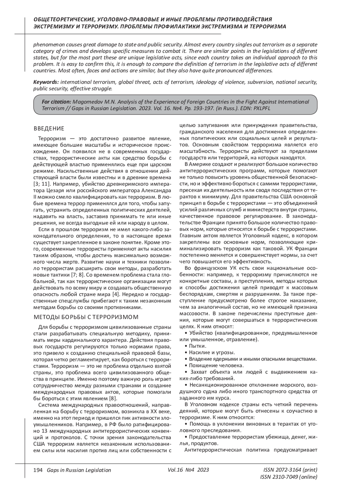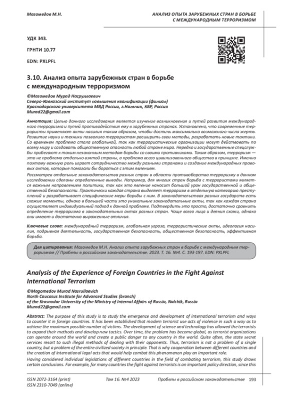 МАГОМЕДОВ М. Н. АНАЛИЗ ОПЫТА ЗАРУБЕЖНЫХ СТРАН В БОРЬБЕ С МЕЖДУНАРОДНЫМ ТЕРРОРИЗМОМ // ПРОБЕЛЫ В РОССИЙСКОМ ЗАКОНОДАТЕЛЬСТВЕ. 2023. Т. 16 № 4