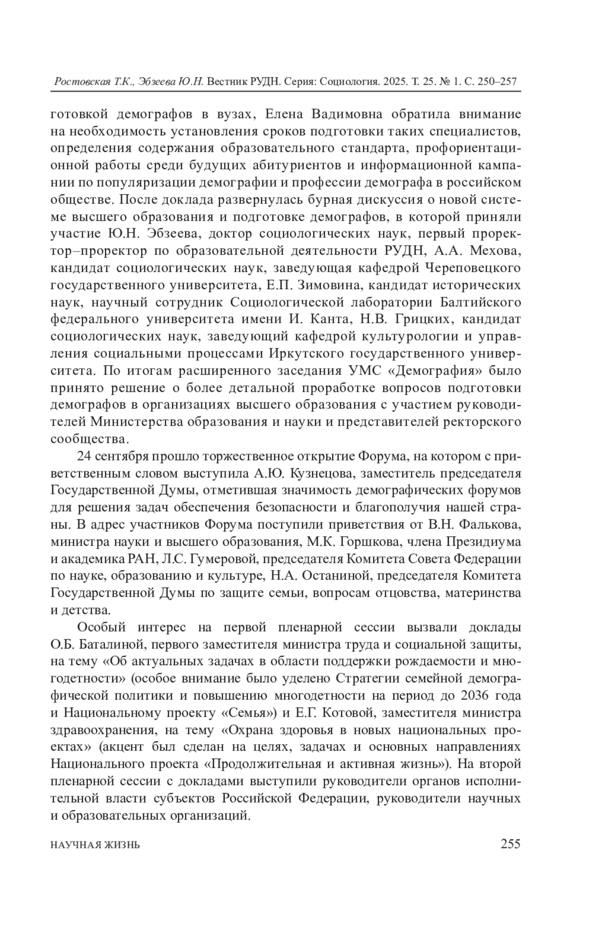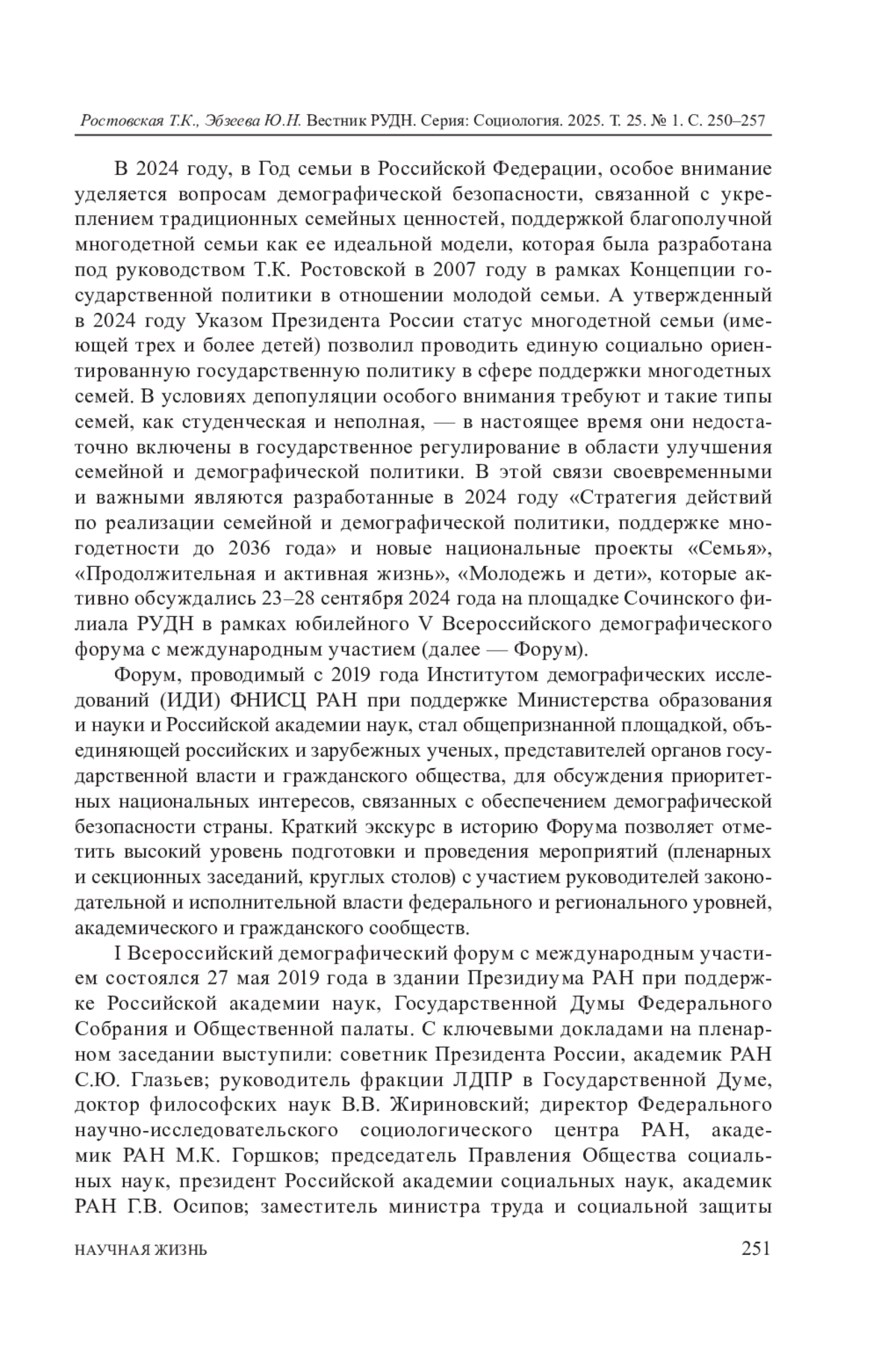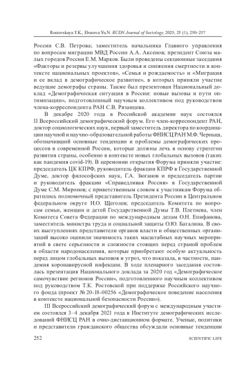 В год 300-летия Российской академии наук и Год семьи в Российской Федерации в Краснодарском крае (городе Сочи) при поддержке РУДН и Министерства труда и социальной защиты состоялся V Всероссийский форум с международным участием, который проводится с 2019 года Институтом демографических исследований (ИДИ) ФНИСЦ РАН. Ключевая цель Форума - оценка демографической ситуации на национальном и международном уровнях в 2023-2024 годы; выработка новых подходов к реализации демографической политики, направленной на повышение рождаемости, формирование мотивации к многодетности и здоровому долгожительству, регулирование рынка труда и миграционных процессов. На пленарных и секционных заседаниях были представлены доклады руководителей федеральных и региональных органов государственной власти, ведущих российских и зарубежных ученых в области демографии, а также «Демографическая энциклопедия в лицах. Т. 1. Дореволюционный период» и Национальный доклад за 2023 год «Демографическое самочувствие регионов России». К Форуму были подготовлены два тематических номера журналов «Высшее образование в России» (№ 8) и «Вопросы управления» (№ 3).