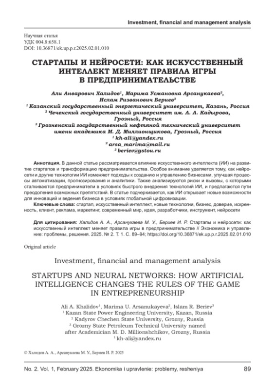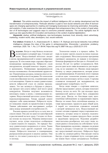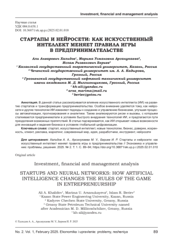 В данной статье рассматривается влияние искусственного интеллекта (ИИ) на развитие стартапов и трансформацию предпринимательства. Особое внимание уделяется тому, как нейросети и другие технологии ИИ изменяют подходы к созданию и управлению бизнесами, улучшая процессы автоматизации, прогнозирования и аналитики. Также анализируются риски и вызовы, с которыми сталкиваются предприниматели в условиях быстрого внедрения технологий ИИ, и предлагаются пути преодоления возможных препятствий. В статье подчеркивается, как ИИ открывает новые возможности для инноваций и ведения бизнеса в условиях глобальной цифровизации.