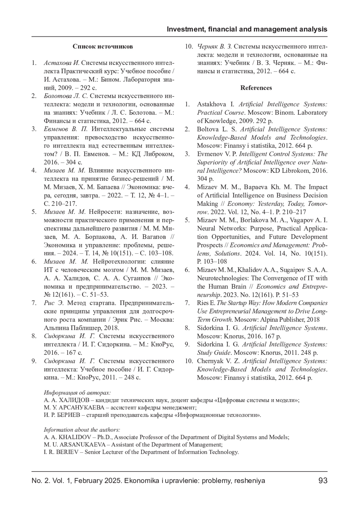 4. Мизаев М. М. Влияние искусственного интеллекта на принятие бизнес-решений / М. М. Мизаев, Х. М. Бапаева // Экономика: вчера, сегодня, завтра. - 2022. - Т. 12, № 4-1. - С. 210-217. EDN: UXTSVO