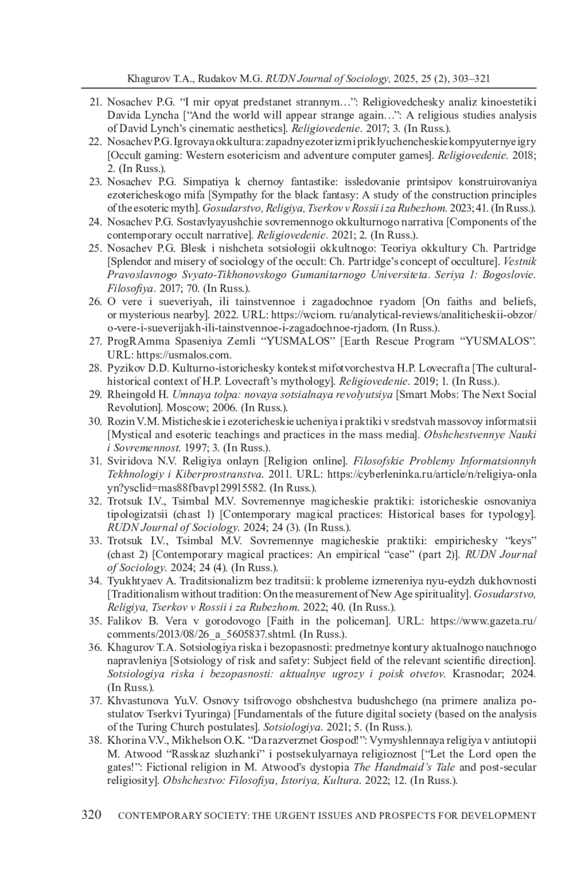 25. Носачев П.Г. Блеск и нищета социологии оккультного: Теория оккультуры К. Партриджа // Вестник Православного Свято-Тихоновского гуманитарного университета. Серия 1: Богословие. Философия. 2017. № 70. DOI: 10.15382/sturI201770.110-125 EDN: YLEBQX