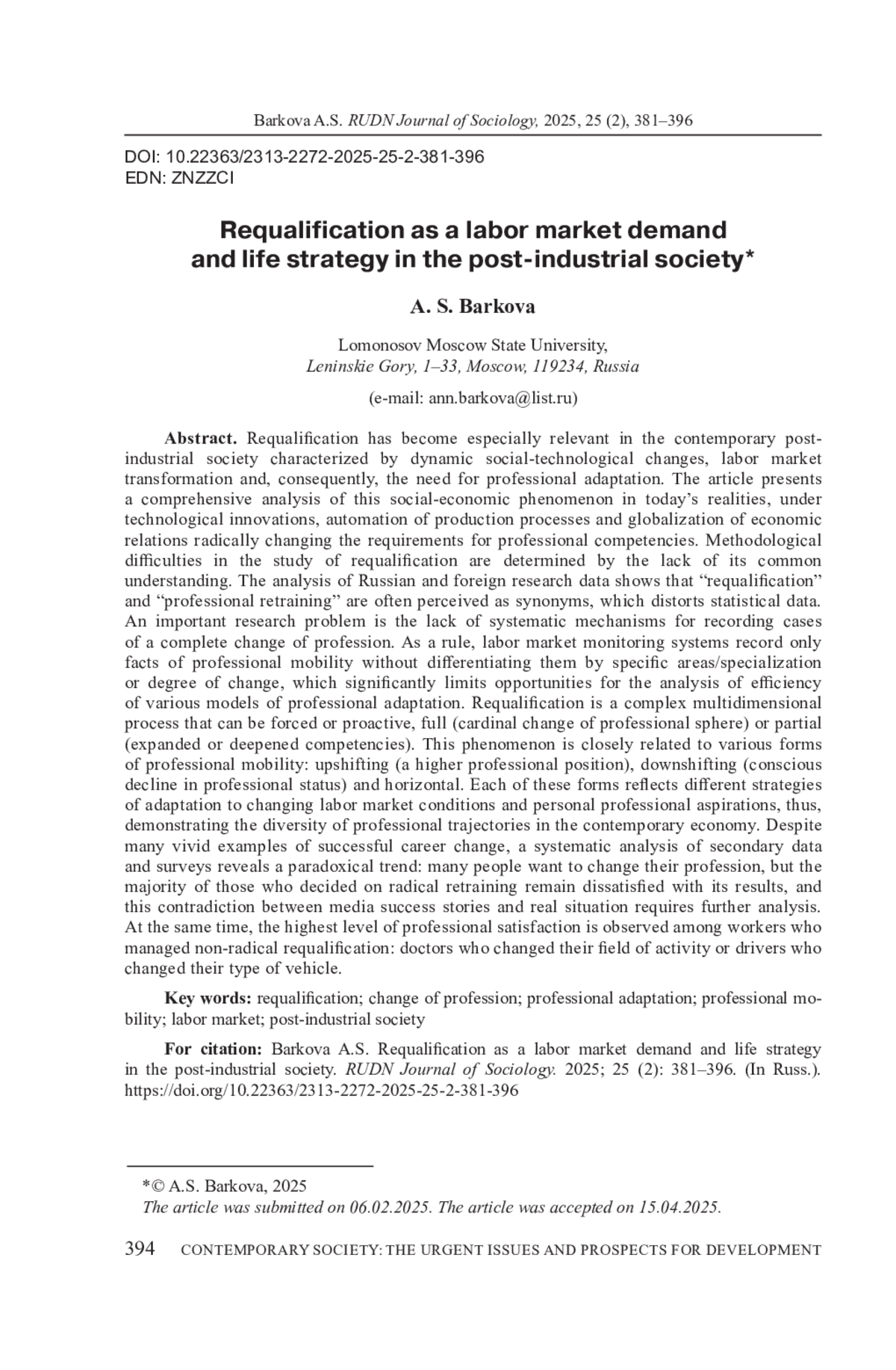 Переквалификации обретает особую актуальность в постиндустриальном обществе, которое характеризуется динамичными социальными и технологическими изменениями, трансформацией рынка труда и, вследствие этого, необходимостью профессиональной адаптации. Статья посвящена комплексному анализу социально-экономического феномена переквалификации в современных реалиях, где технологические инновации, внедрение искусственного интеллекта и изменения в жизненных стратегиях кардинально меняют требования к профессиональным компетенциям. Методологические сложности в изучении переквалификации связаны с отсутствием ее единого понимания. Анализ отечественных и зарубежных источников показывает, что понятия «переквалификация» и «профессиональная переподготовка» часто воспринимаются как синонимы, что искажает статистические данные. Важной исследовательской проблемой является и отсутствие системных механизмов учета полной смены профессии. Системы мониторинга рынка труда, как правило, фиксируют лишь факты профессиональной мобильности, не дифференцируя их по конкретным направлениям или радикальности изменений, что существенно ограничивает возможности анализа эффективности разных моделей переквалификации. Таковая представляет собой сложный многоаспектный процесс, который может носить вынужденный характер или быть инициативным. По радикальности она подразделяется на полную (кардинальная смена профессиональной сферы) и частичную (расширение или углубление компетенций) и тесно связана с разными формами профессиональной мобильности: апшифтингом (переход на более высокую социальную и профессиональную позицию), дауншифтингом (сознательное снижение профессионального статуса) и горизонтальной мобильностью. Каждая форма отражает особые стратегии адаптации работников к изменяющимся условиям рынка труда и реализации личных профессиональных устремлений. Несмотря на обилие ярких примеров успешной кардинальной смены профессии, системный анализ вторичных данных и результатов опросов выявляет парадоксальную тенденцию: значительное количество людей хочет сменить профессию, но большая часть тех, кто осуществил кардинальную переквалификацию, не удовлетворены ее результатами, и это противоречие между медийными историями успеха и реальной статистикой требует осмысления. В то же время наибольший уровень профессиональной удовлетворенности наблюдается у работников, осуществивших нерадикальные формы переквалификации (например, у врачей, которые сменили направление деятельности, или водителей, пересевших на другое транспортное средство).