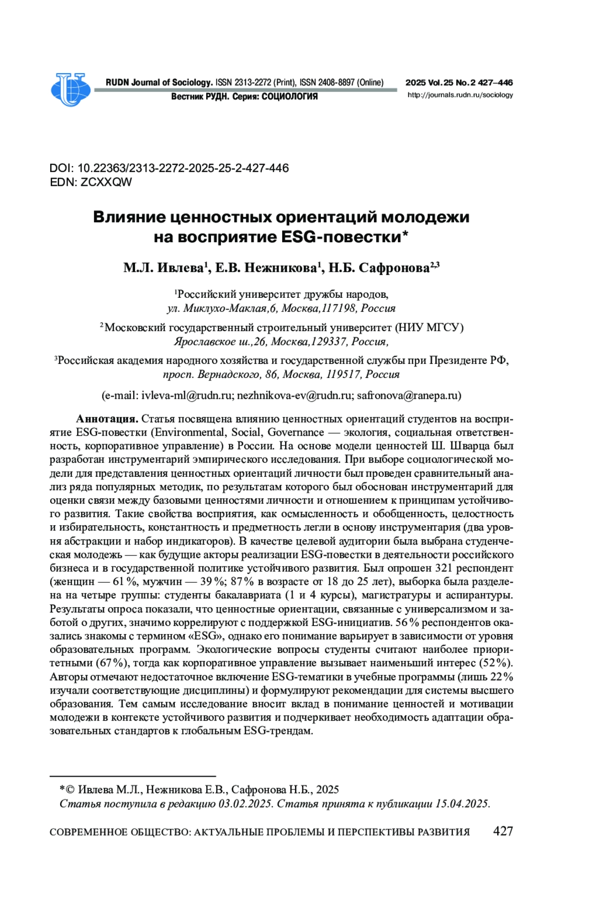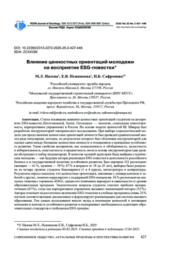 Статья посвящена влиянию ценностных ориентаций студентов на восприятие ESG-повестки (Environmental, Social, Governance - экология, социальная ответственность, корпоративное управление) в России. На основе модели ценностей Ш. Шварца был разработан инструментарий эмпирического исследования. При выборе социологической модели для представления ценностных ориентаций личности был проведен сравнительный анализ ряда популярных методик, по результатам которого был обоснован инструментарий для оценки связи между базовыми ценностями личности и отношением к принципам устойчивого развития. Такие свойства восприятия, как осмысленность и обобщенность, целостность и избирательность, константность и предметность легли в основу инструментария (два уровня абстракции и набор индикаторов). В качестве целевой аудитории была выбрана студенческая молодежь - как будущие акторы реализации ESG-повестки в деятельности российского бизнеса и в государственной политике устойчивого развития. Был опрошен 321 респондент (женщин - 61 %, мужчин - 39 %; 87 % в возрасте от 18 до 25 лет), выборка была разделена на четыре группы: студенты бакалавриата (1 и 4 курсы), магистратуры и аспирантуры. Результаты опроса показали, что ценностные ориентации, связанные с универсализмом и заботой о других, значимо коррелируют с поддержкой ESG-инициатив. 56 % респондентов оказались знакомы с термином «ESG», однако его понимание варьирует в зависимости от уровня образовательных программ. Экологические вопросы студенты считают наиболее приоритетными (67 %), тогда как корпоративное управление вызывает наименьший интерес (52 %). Авторы отмечают недостаточное включение ESG-тематики в учебные программы (лишь 22 % изучали соответствующие дисциплины) и формулируют рекомендации для системы высшего образования. Тем самым исследование вносит вклад в понимание ценностей и мотивации молодежи в контексте устойчивого развития и подчеркивает необходимость адаптации образовательных стандартов к глобальным ESG-трендам.