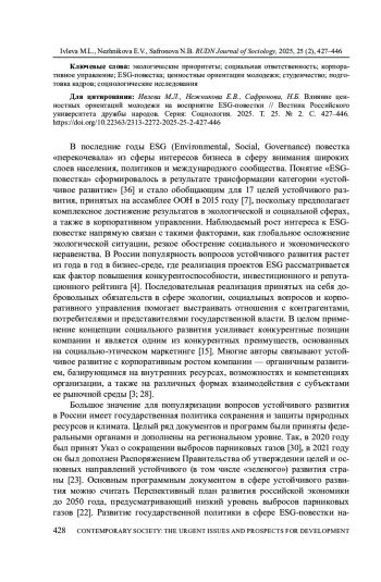 13. Козырев Н.А., Маркина А.М. Перспективы развития принципов управления ESG в России // Вестник евразийской науки. 2022. Т. 14. № 1. EDN: KVUBVJ