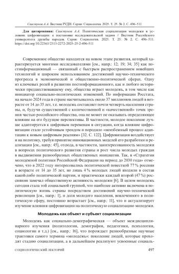Статья посвящена актуальной проблеме политической социализации молодежи в условиях быстрого развития цифровых технологий: рассматриваются современные подходы к изучению ценностных приоритетов молодежи и различные концепции ее социализации в контексте влияния цифровизации на политическую социализацию молодых поколений; рассмотрены сложившиеся подходы к трактовке «цифрового общества» и обоснован запрос на выбор такой концепции, которая бы отражала реальное положение дел и способствовала более стабильному и самостоятельному политическому развитию общества; обозначены ключевые аспекты цифровой социализации как основания для более глубокого изучения молодежной политической социализации. Структурно статья состоит из трех частей: в первом разделе кратко охарактеризована специфика социологической трактовки социализации в отношении молодежи как особой социально-демографической группы; во втором разделе обоснован «статус» цифровизации как нового социализационного фактора (и даже альтернативы традиционным агентам социализации) в современном обществе на микрои макроуровне благодаря сложному переплетению очевидных преимуществ и значительных рисков; в третьем разделе перечислены ключевые особенности, механизмы и последствия воздействия цифровизации на особый аспект взросления молодых поколений - политическую социализацию (в узком и широком смысле данного понятия) в ее массовых проявлениях. В итоге автор приходит к выводу, что сегодня политическая социализация представляет собой междисциплинарный объект научного интереса, изучение которого должно учитывать формирование новой социальной реальности под воздействием тенденций цифровизации на технологическом и социально-символическом уровнях. Соответственно, необходима обновленная концепция цифровой политической социализации молодежи, которая бы стала теоретико-методологической основой для дальнейших фундаментальных и прикладных исследований. Такая концепция призвана помочь в обеспечении стабильного политического развития общества, адаптируя молодежь к вызовам, обусловленным динамичными изменениями в политической сфере.