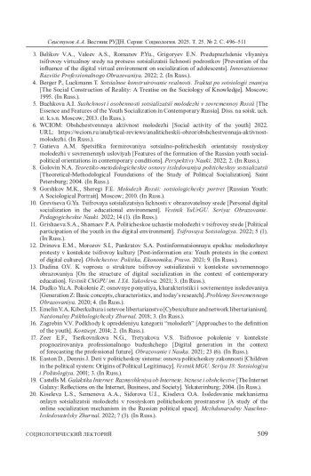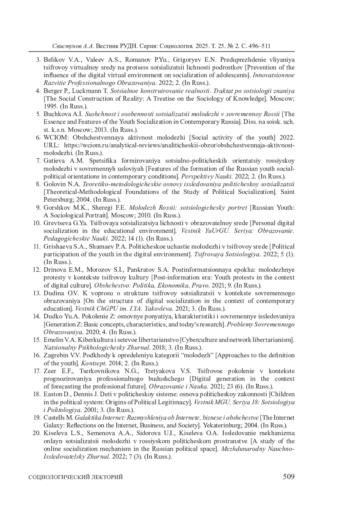 36. Самсонова Т.Н., Леонов Е.К. Роль интернета в политической социализации современной российской молодежи // Вестник Московского университета. Серия 18: Социология и политология. 2022. Т. 28. № 4. EDN: OOTHYR