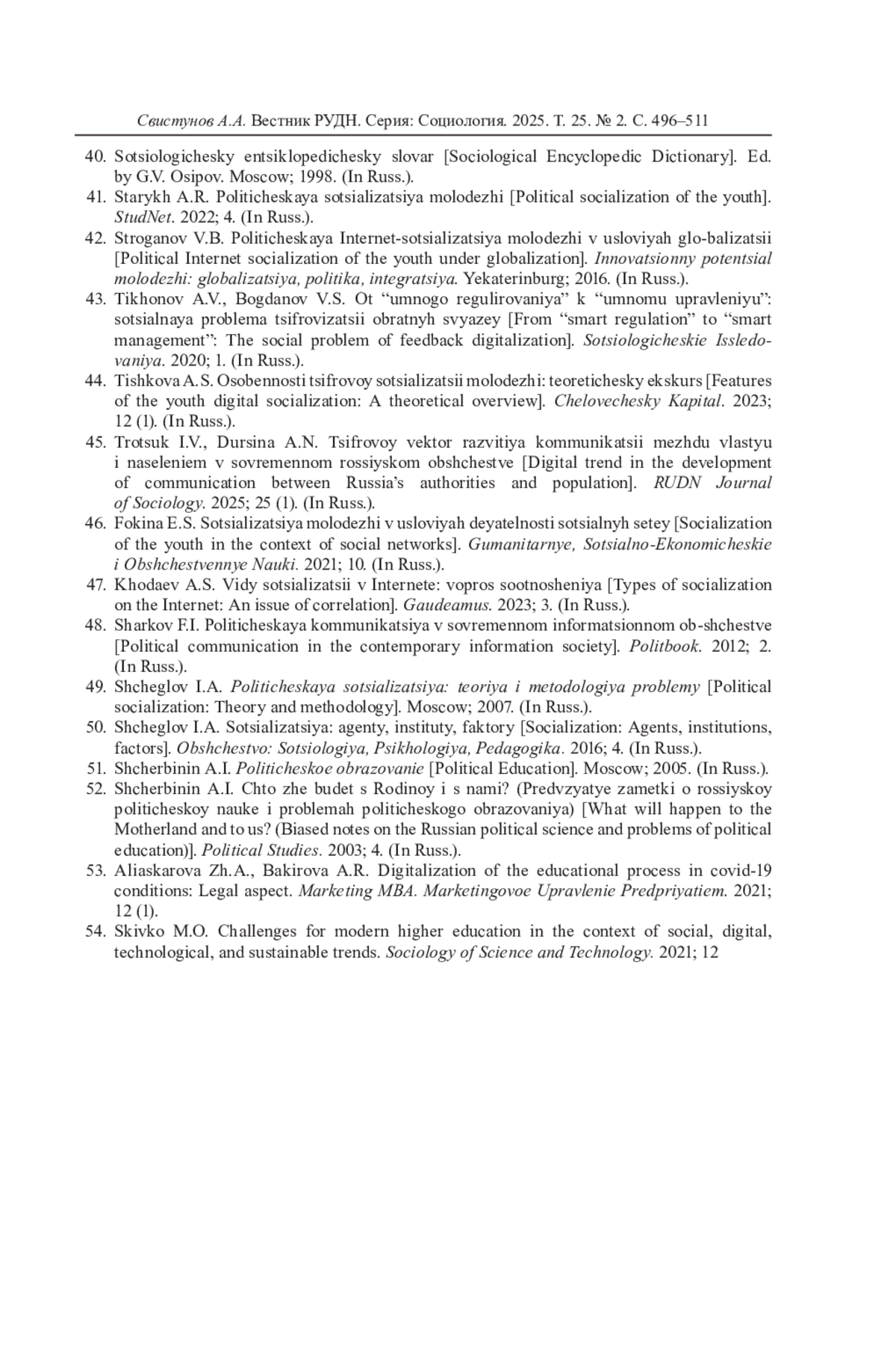 45. Троцук И.В., Дурсина А.Н. Цифровой вектор развития коммуникации между властью и населением в современном российском обществе // Вестник РУДН. Серия: Социология. 2025. Т. 25. № 1. EDN: ETHFJQ