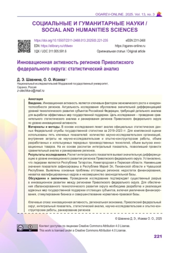 Цель исследования – проведение сравнительного статистического анализа и ранжирования регионов Приволжского федерального округа по уровню инновационной активности.