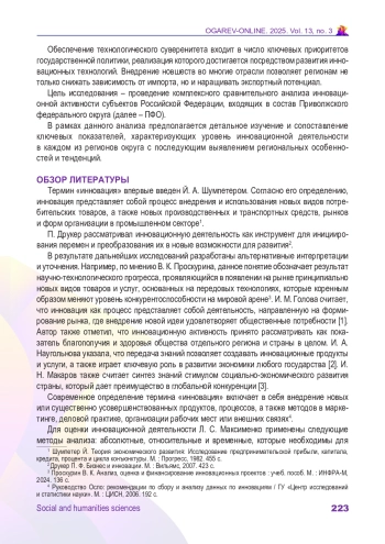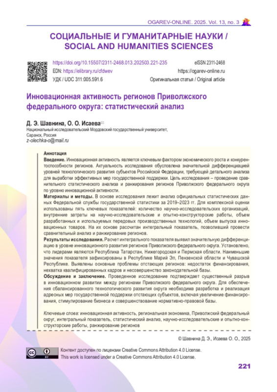 Введение. Инновационная активность является ключевым фактором экономического роста и конкурентоспособности регионов. Актуальность исследования обусловлена значительной дифференциацией уровней технологического развития субъектов Российской Федерации, требующей детального анализа для выработки эффективных мер государственной поддержки.