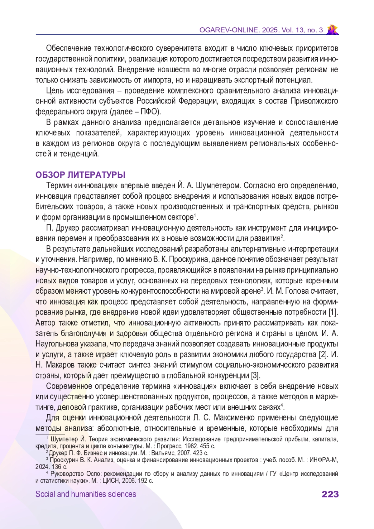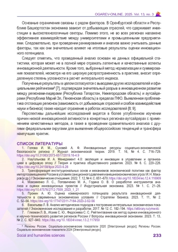1. Голова И. М., Суховей А. Ф. Инновационные ресурсы социально-экономической безопасности региона // Журнал экономической теории. 2019. Т. 16, № 4. С. 716-729. DOI: 10.31063/2073-6517/2019.16-4.9
