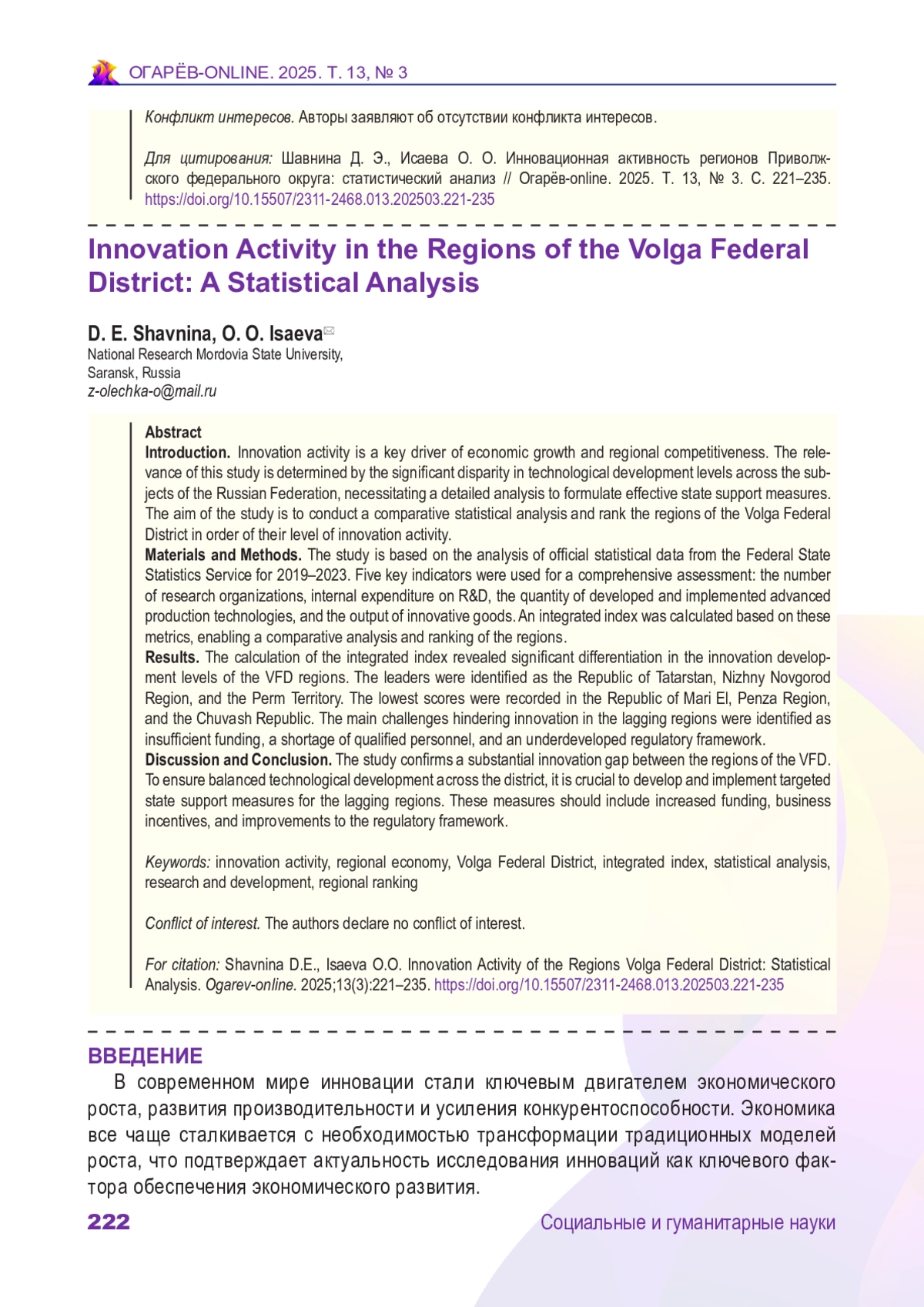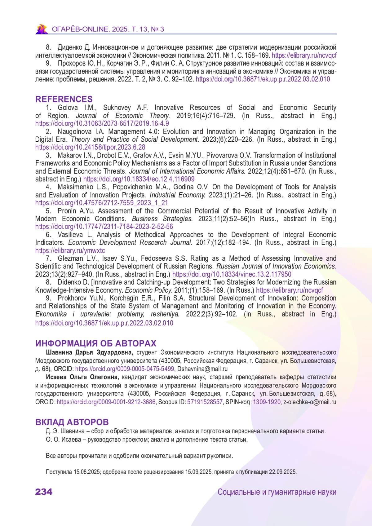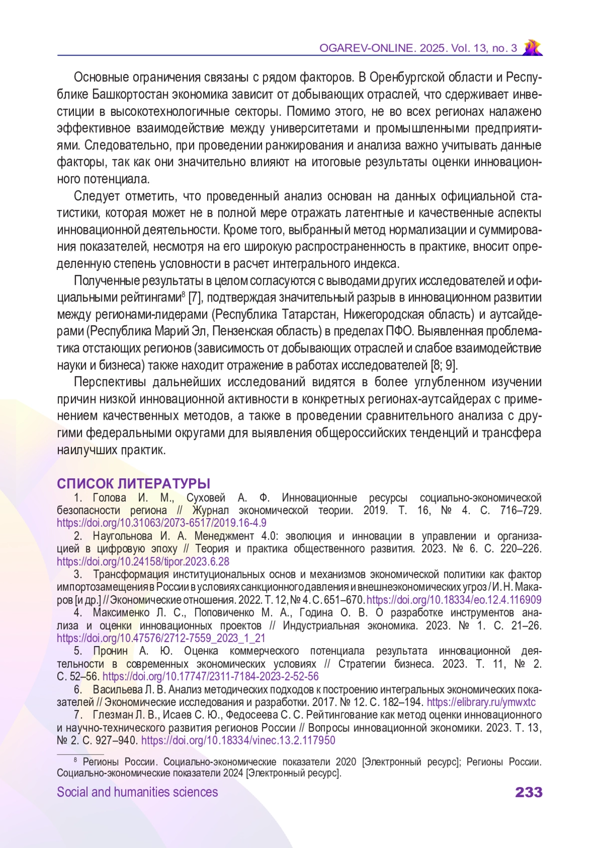 7. Глезман Л. В., Исаев С. Ю., Федосеева С. С. Рейтингование как метод оценки инновационного и научно-технического развития регионов России // Вопросы инновационной экономики. 2023. Т. 13, № 2. С. 927-940. DOI: 10.18334/vinec.13.2.117950