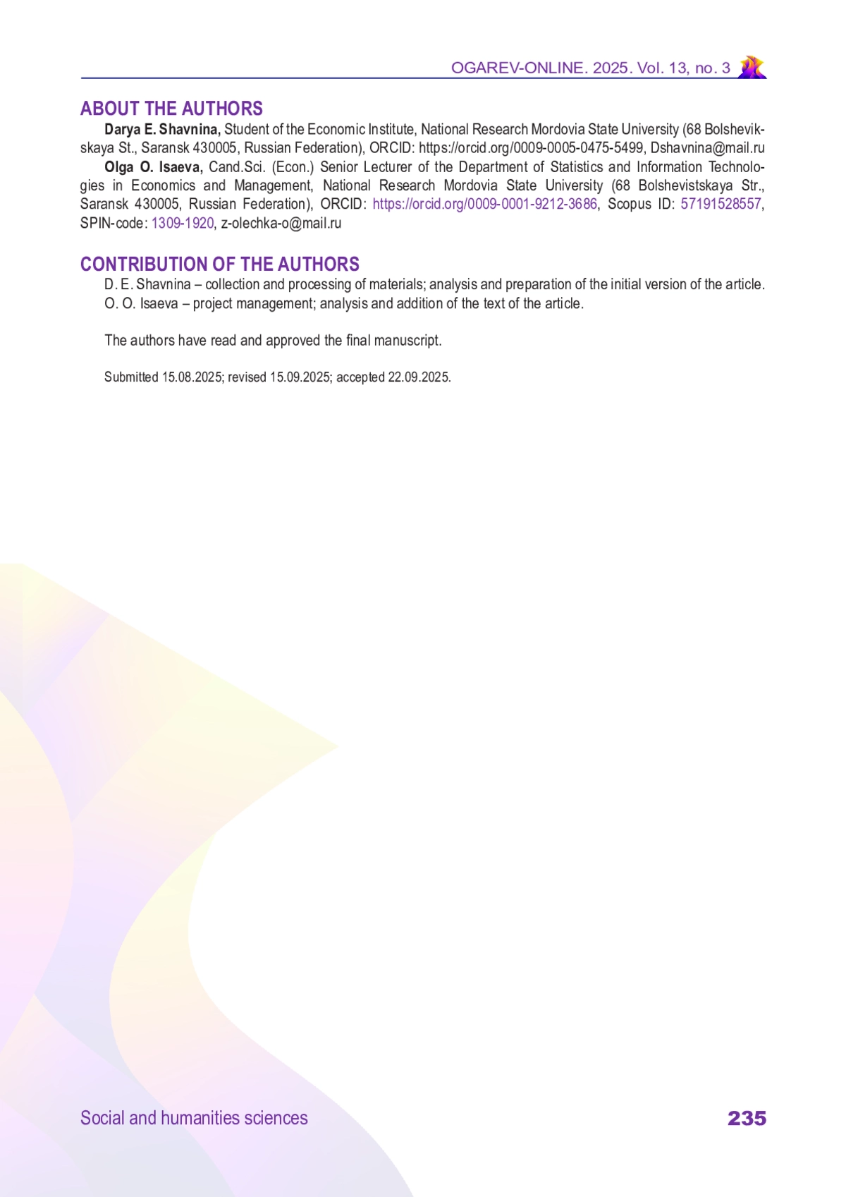 Материалы и методы. Эмпирическую базу составили результаты онлайн-опроса 483 студентов Национального исследовательского Мордовского государственного университета (март – апрель 2025 г.). Использованы методы кластерного анализа (SPSS), описательной статистики и кросс-табуляции. Операционализация вовлеченности включала поведенческие, когнитивные и эмоциональные аспекты.