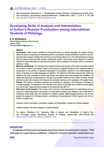 Введение. В современных условиях обучения русскому языку как иностранному особую актуальность приобретает проблема формирования у иностранных учащихся навыков анализа и интерпретации авторской пунктуации. Несмотря на значимость пунктуационной грамотности для полноценного понимания художественного текста, данный аспект обучения часто остается недостаточно разработанным. Цель исследования – формирование у иностранных учащихся умений анализировать и интерпретировать авторские пунктуационные решения в текстах.