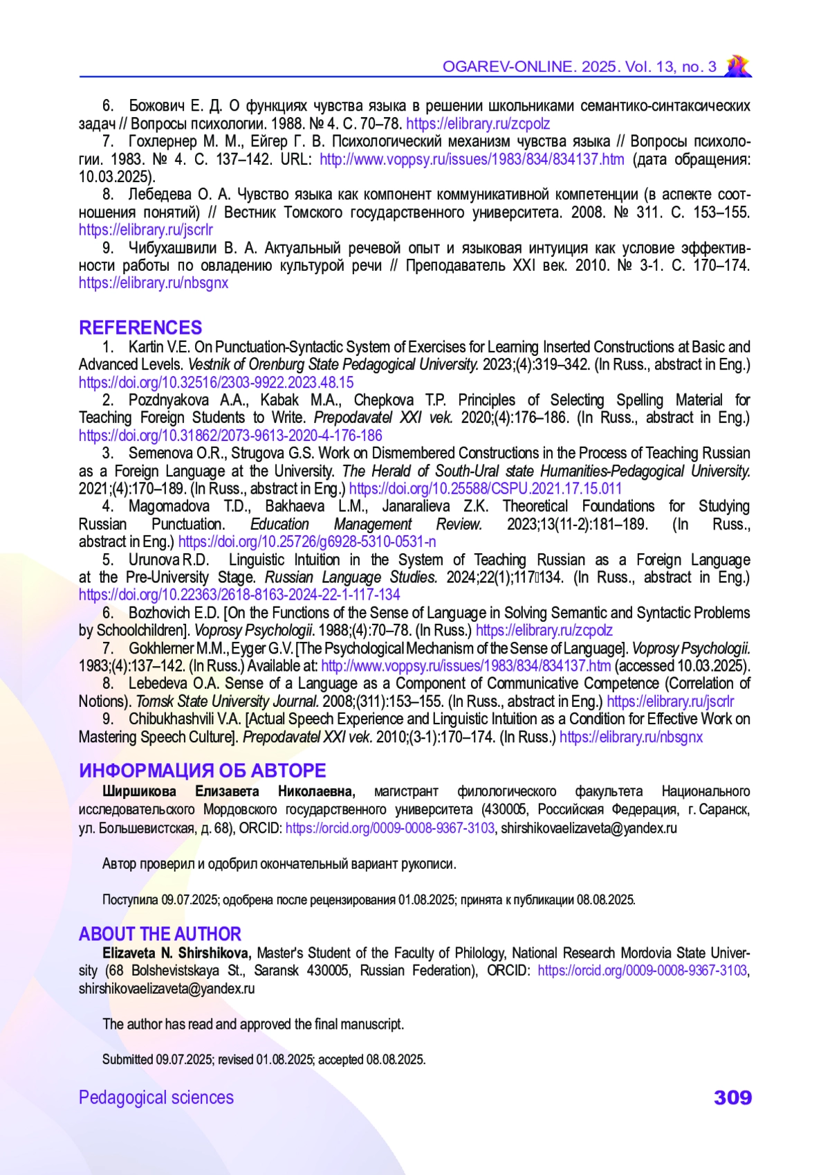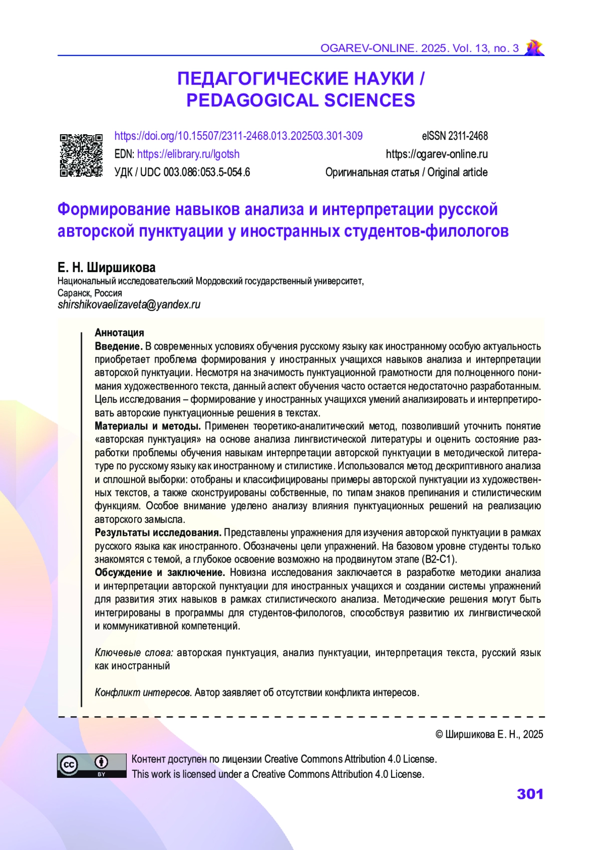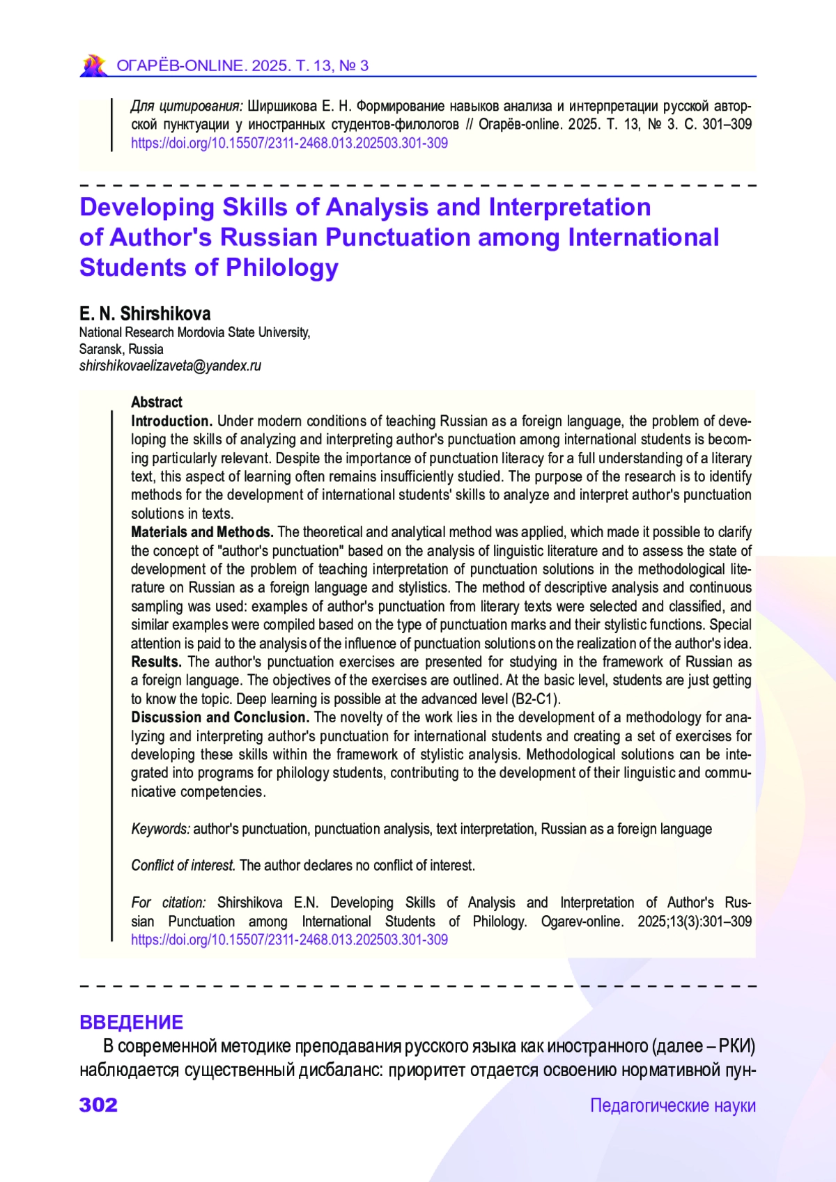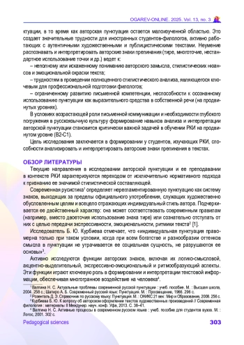 ШИРШИКОВА Е. Н. ФОРМИРОВАНИЕ НАВЫКОВ АНАЛИЗА И ИНТЕРПРЕТАЦИИ РУССКОЙ АВТОРСКОЙ ПУНКТУАЦИИ У ИНОСТРАННЫХ СТУДЕНТОВ-ФИЛОЛОГОВ // ОГАРЁВ-ONLINE. 2025. № 3 (220), ТОМ 13