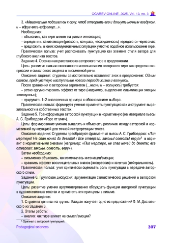 Обсуждение и заключение. Новизна исследования заключается в разработке методики анализа и интерпретации авторской пунктуации для иностранных учащихся и создании системы упражнений для развития этих навыков в рамках стилистического анализа. Методические решения могут быть интегрированы в программы для студентов-филологов, способствуя развитию их лингвистической и коммуникативной компетенций.