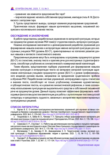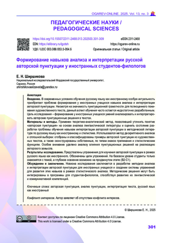 Статья: Формирование навыков анализа и интерпретации русской авторской пунктуации у иностранных студентов-филологов (2025)