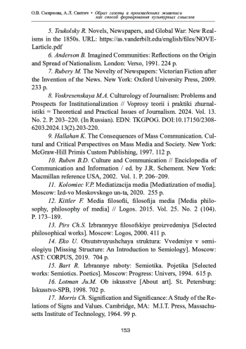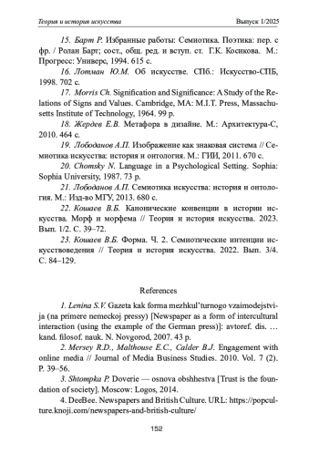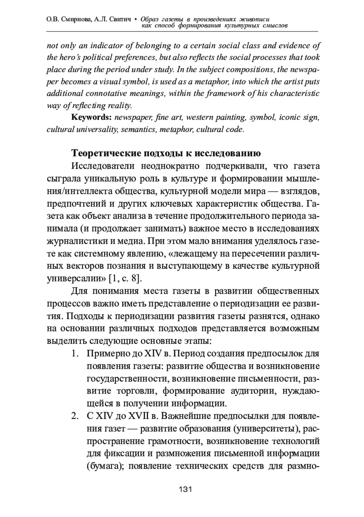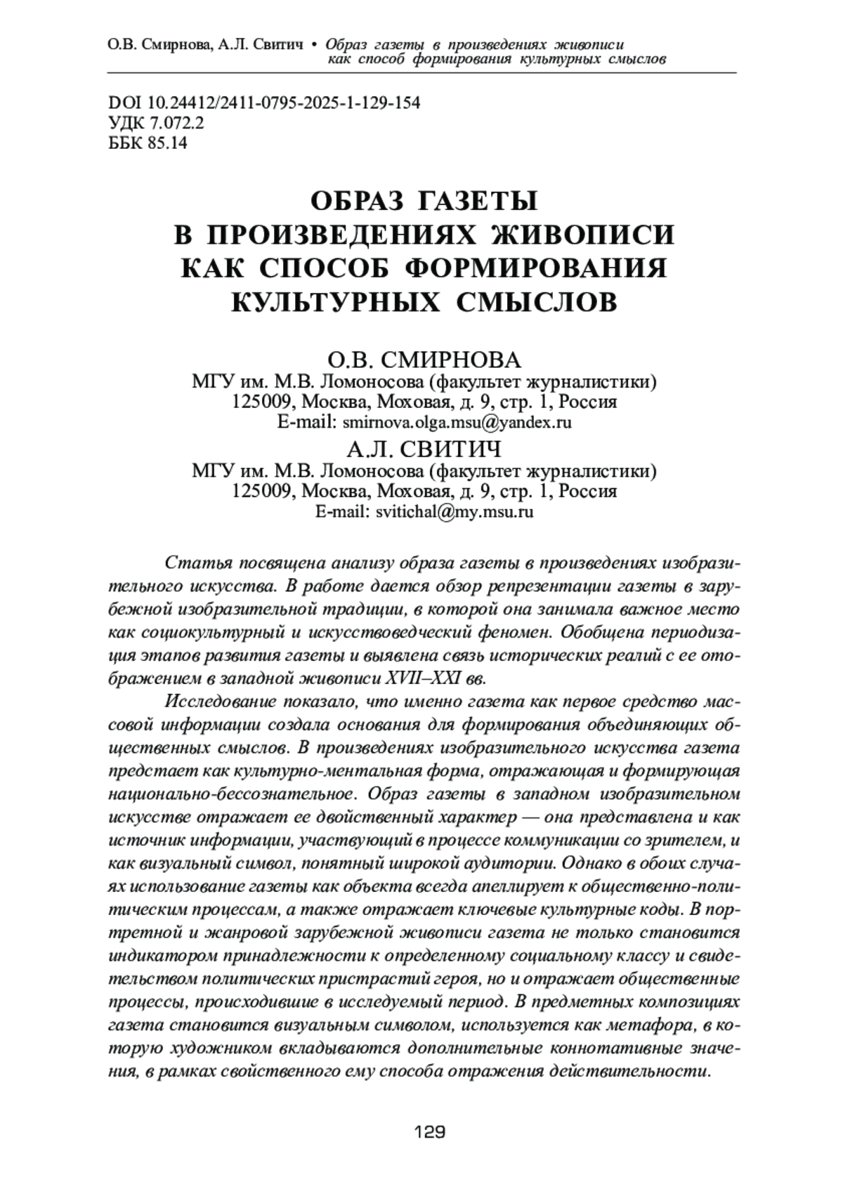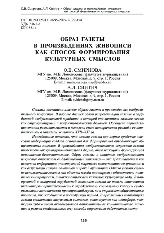 СМИРНОВА О. В., СВИТИЧ А. Л. ОБРАЗ ГАЗЕТЫ В ПРОИЗВЕДЕНИЯХ ЖИВОПИСИ КАК СПОСОБ ФОРМИРОВАНИЯ КУЛЬТУРНЫХ СМЫСЛОВ // ТЕОРИЯ И ИСТОРИЯ ИСКУССТВА. 2025. № 1