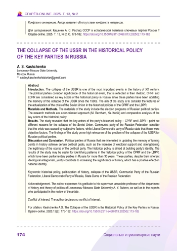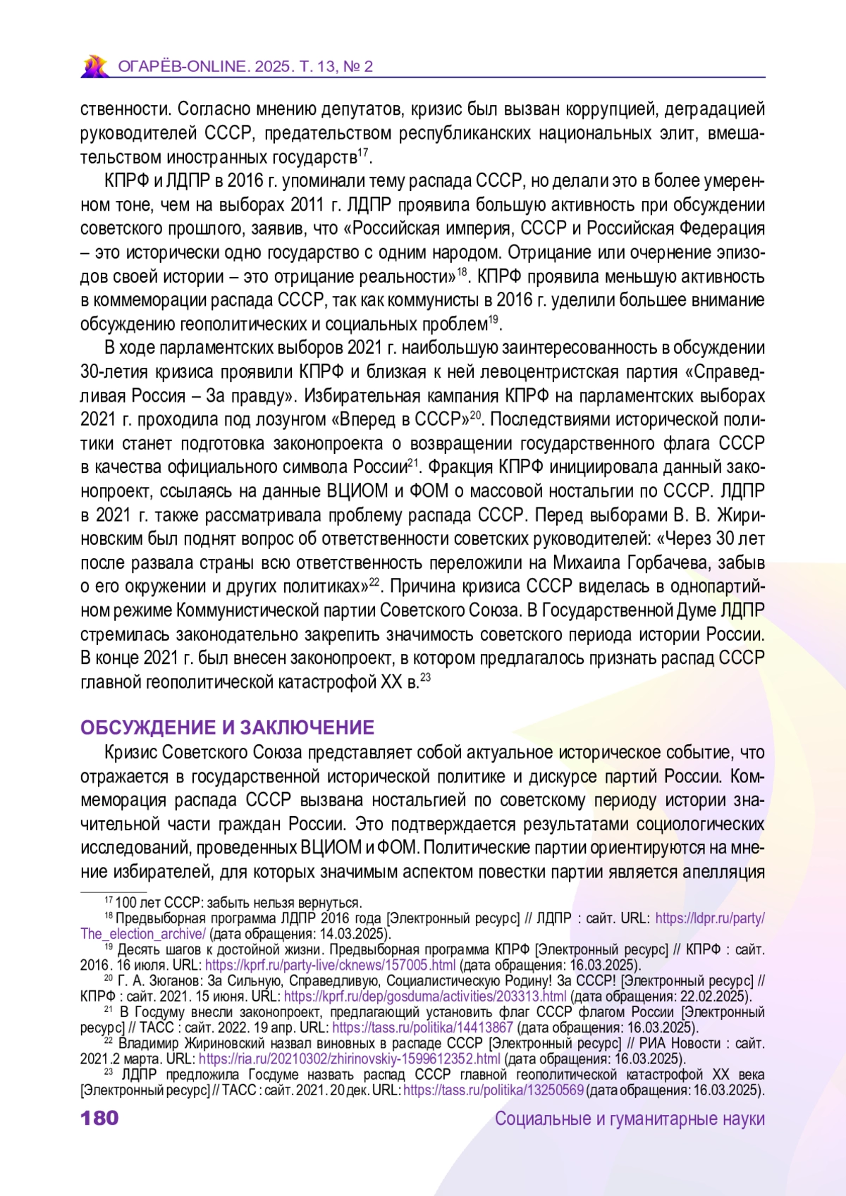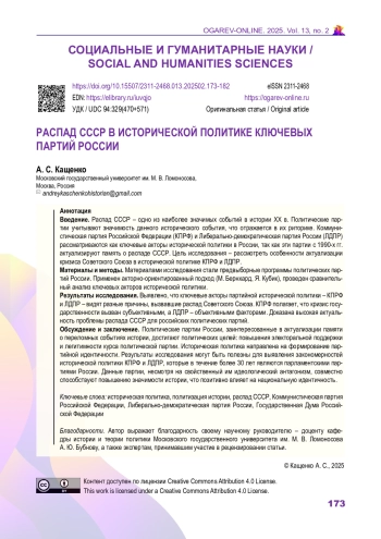 Введение. Распад СССР – одно из наиболее значимых событий в истории XX в. Политические партии учитывают значимость данного исторического события, что отражается в их риторике. Коммунистическая партия Российской Федерации (КПРФ) и Либерально-демократическая партия России (ЛДПР) рассматриваются как ключевые акторы исторической политики в России, так как эти партии с 1990-х гг. актуализируют память о распаде СССР. Цель исследования – рассмотреть особенности актуализации кризиса Советского Союза в исторической политике КПРФ и ЛДПР.