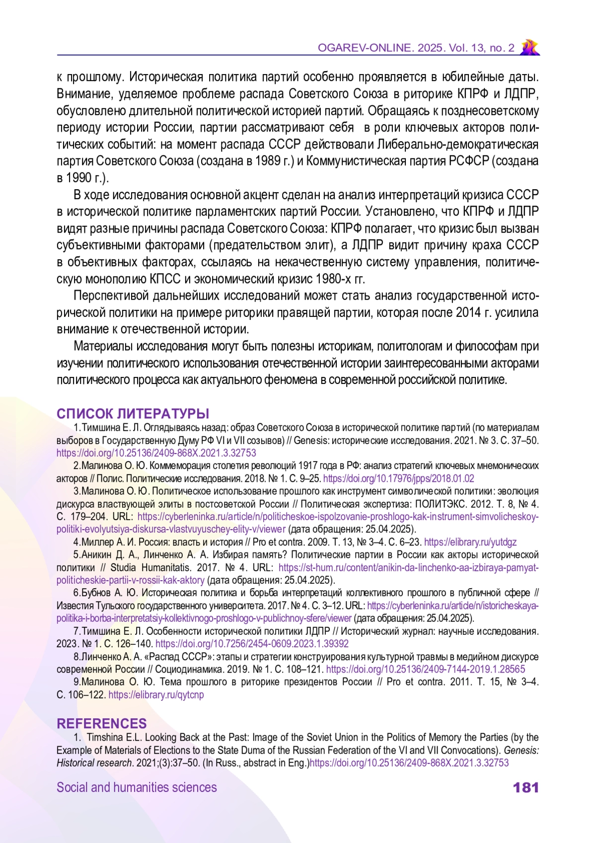 1. Тимшина Е. Л. Оглядываясь назад: образ Советского Союза в исторической политике партий (по материалам выборов в Государственную Думу РФ VI и VII созывов) // Genesis: исторические исследования. 2021. № 3. С. 37-50. DOI: 10.25136/2409-868X.2021.3.32753