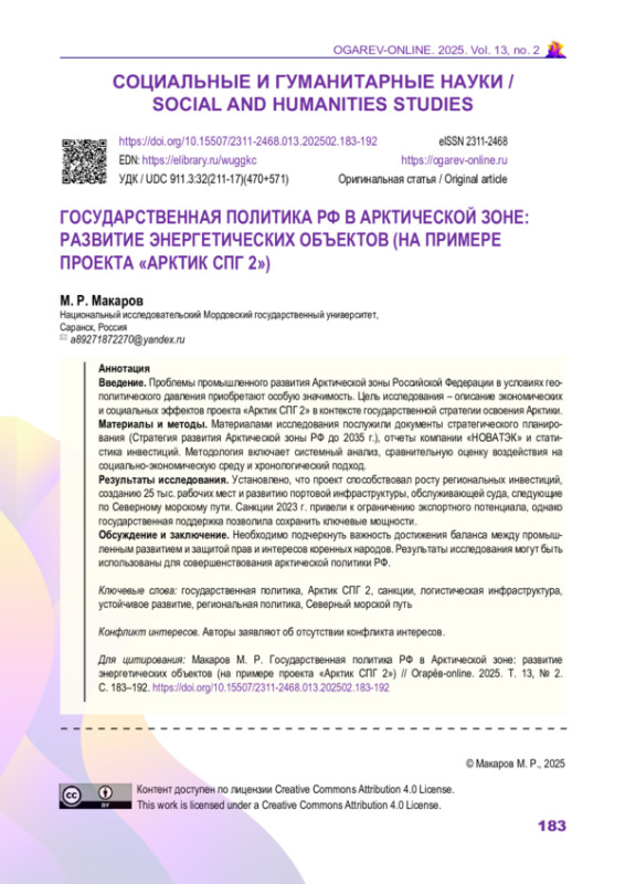 Введение. Проблемы промышленного развития Арктической зоны Российской Федерации в условиях геополитического давления приобретают особую значимость. Цель исследования – описание экономических и социальных эффектов проекта «Арктик СПГ 2» в контексте государственной стратегии освоения Арктики.