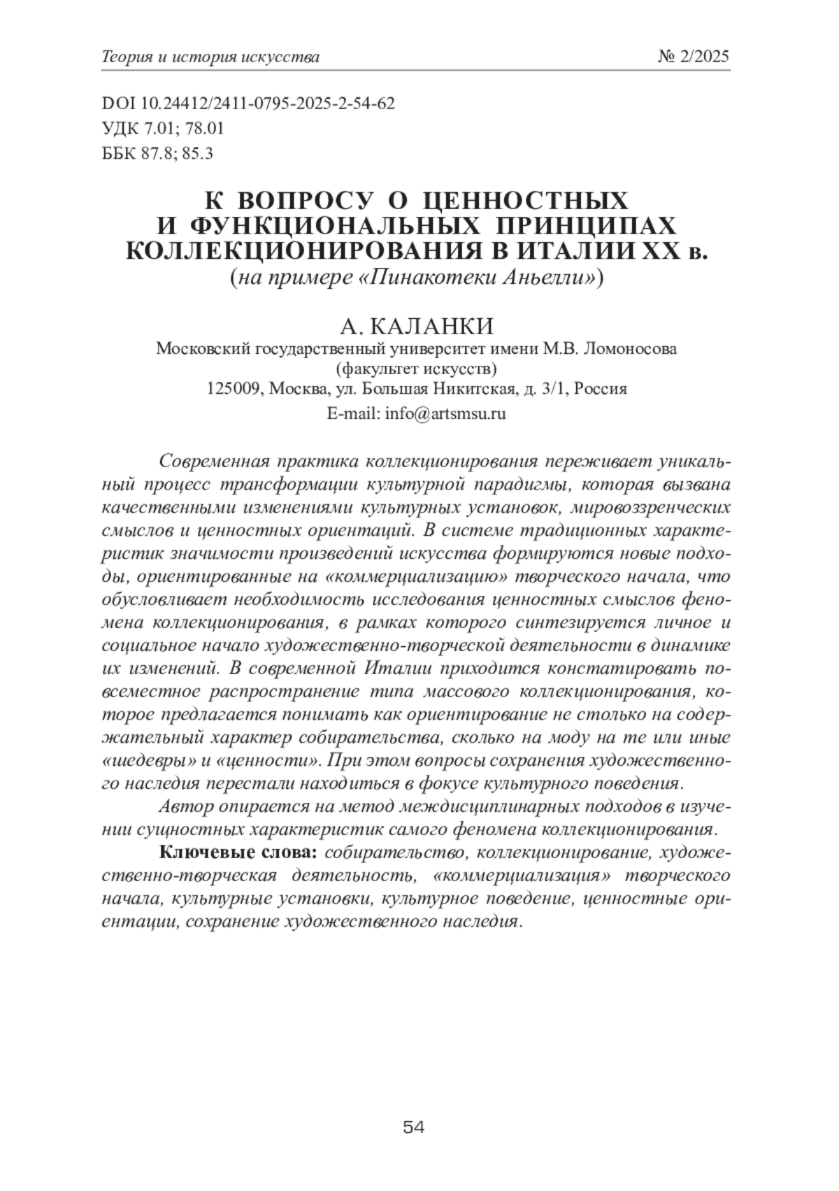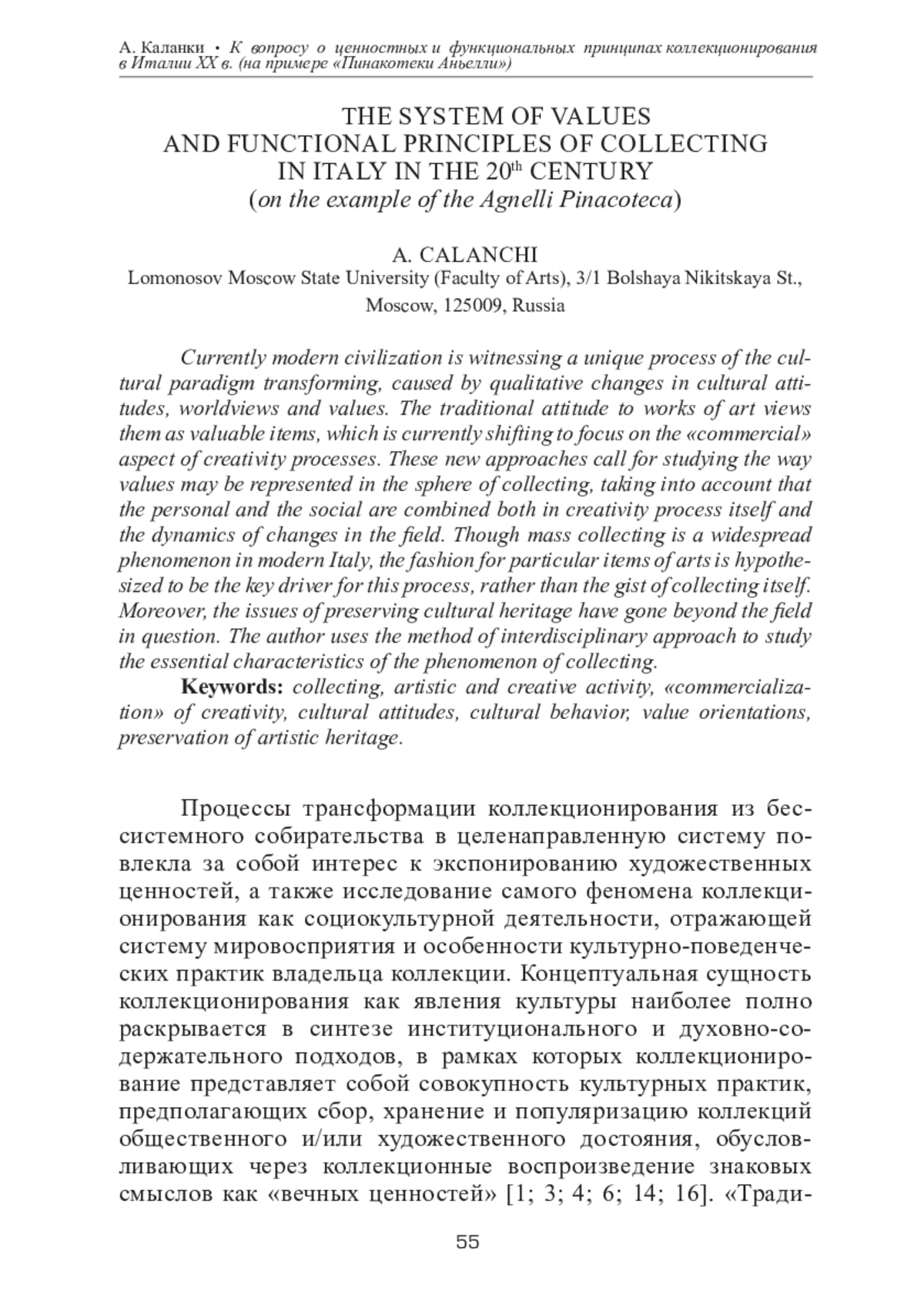 Современная практика коллекционирования переживает уникальный процесс трансформации культурной парадигмы, которая вызвана качественными изменениями культурных установок, мировоззренческих смыслов и ценностных ориентаций. В системе традиционных характеристик значимости произведений искусства формируются новые подходы, ориентированные на «коммерциализацию» творческого начала, что обусловливает необходимость исследования ценностных смыслов феномена коллекционирования, в рамках которого синтезируется личное и социальное начало художественно-творческой деятельности в динамике их изменений. В современной Италии приходится констатировать повсеместное распространение типа массового коллекционирования, которое предлагается понимать как ориентирование не столько на содержательный характер собирательства, сколько на моду на те или иные «шедевры» и «ценности». При этом вопросы сохранения художественного наследия перестали находиться в фокусе культурного поведения. Автор опирается на метод междисциплинарных подходов в изучении сущностных характеристик самого феномена коллекционирования.