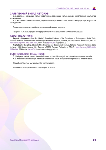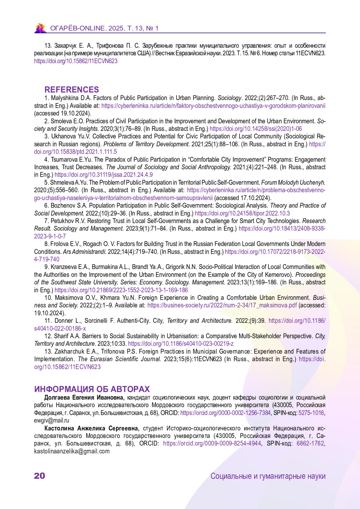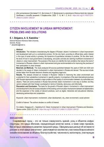 ДОЛГАЕВА Е. И., КАСТОЛИНА А. С. ВОВЛЕЧЕННОСТЬ НАСЕЛЕНИЯ В БЛАГОУСТРОЙСТВО ГОРОДОВ: ПРОБЛЕМЫ И СПОСОБЫ РЕШЕНИЯ // ОГАРЁВ-ONLINE. 2025. № 1 (218), ТОМ 13