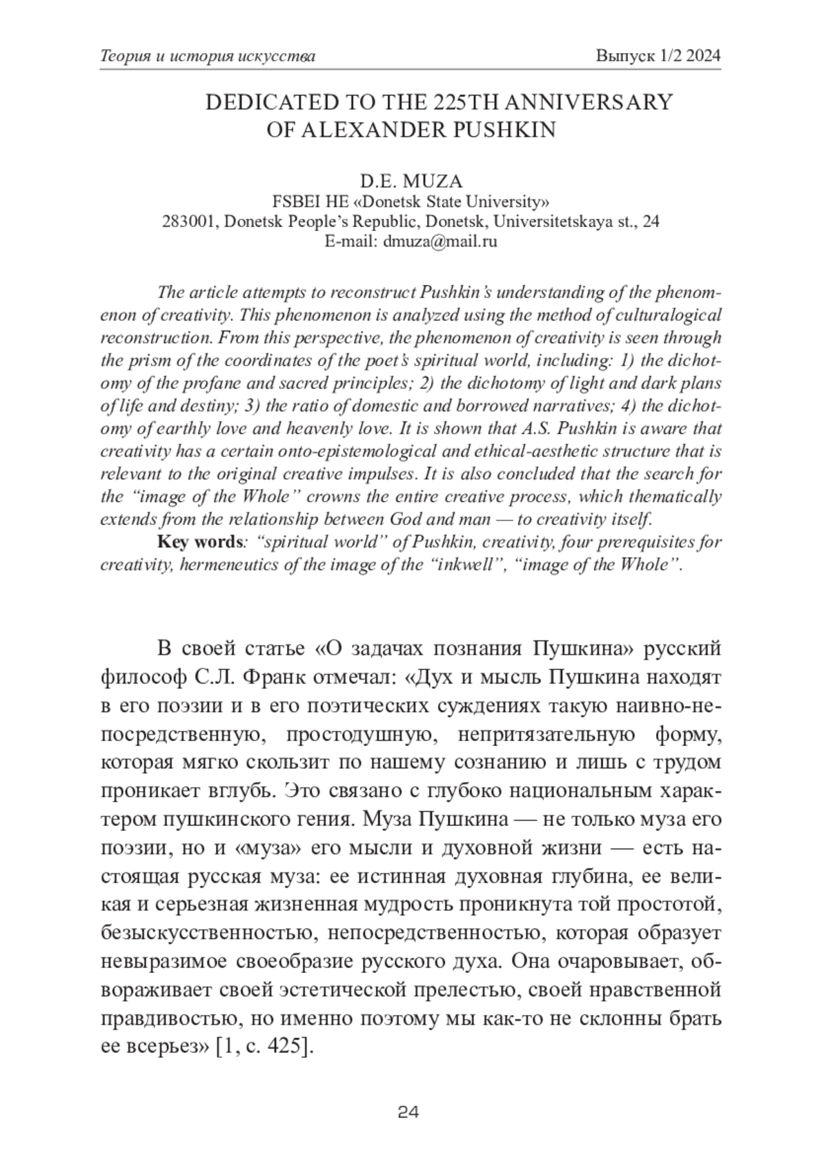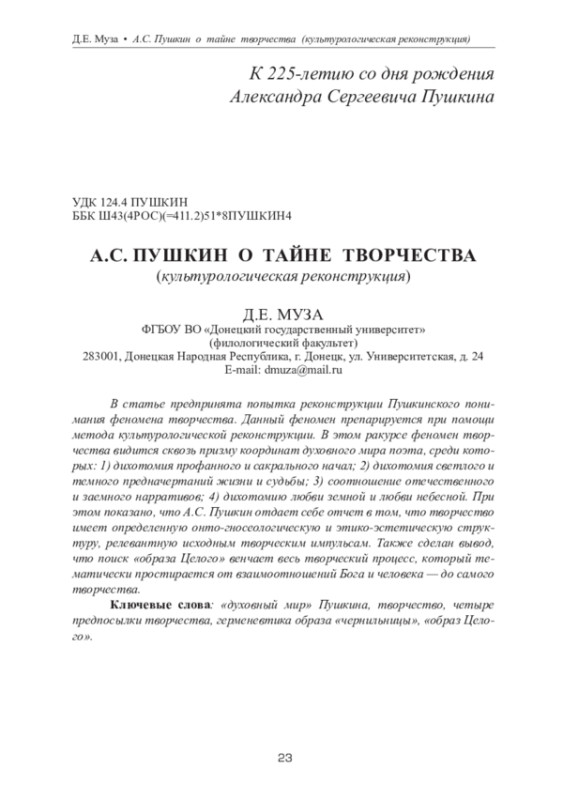 В статье предпринята попытка реконструкции Пушкинского понимания феномена творчества. Данный феномен препарируется при помощи метода культурологической реконструкции. В этом ракурсе феномен творчества видится сквозь призму координат духовного мира поэта, среди которых: 1) дихотомия профанного и сакрального начал; 2) дихотомия светлого и темного предначертаний жизни и судьбы; 3) соотношение отечественного и заемного нарративов; 4) дихотомию любви земной и любви небесной. При этом показано, что А. С. Пушкин отдает себе отчет в том, что творчество имеет определенную онто-гносеологическую и этико-эстетическую структуру, релевантную исходным творческим импульсам. Также сделан вывод, что поиск «образа Целого» венчает весь творческий процесс, который тематически простирается от взаимоотношений Бога и человека — до самого творчества