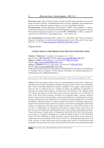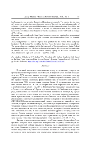 4. Бахмет О.Н. Запасы углерода в почвах сосновых и еловых лесов Карелии // Лесоведение. 2018. No 1. С. 48-55. EDN: YMNLUG
