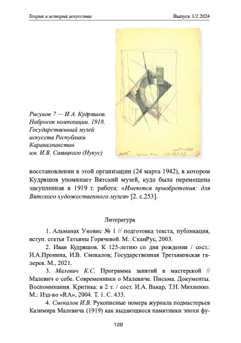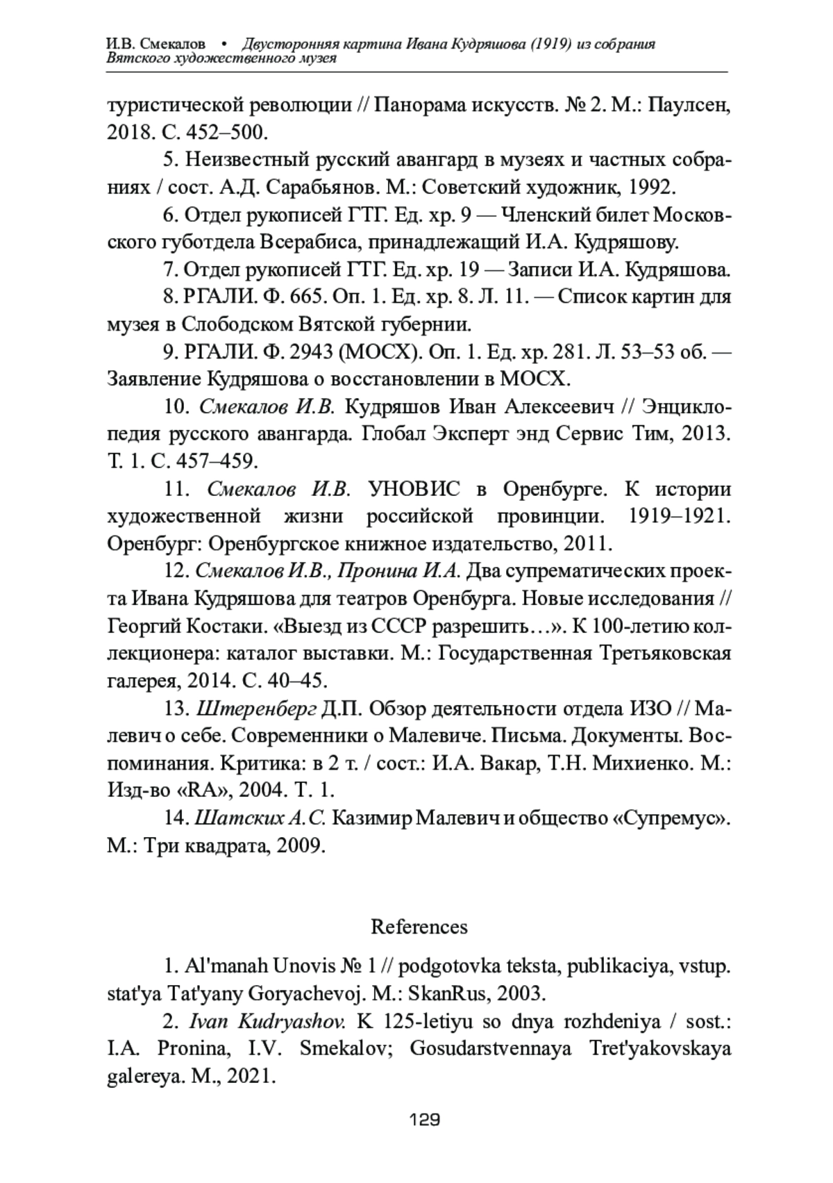 4. Смекалов И.В. Рукописные номера журнала подмастерьев Казимира Малевича (1919) как выдающиеся памятники эпохи футуристической революции // Панорама искусств. № 2. М.: Паулсен, 2018. С. 452-500.