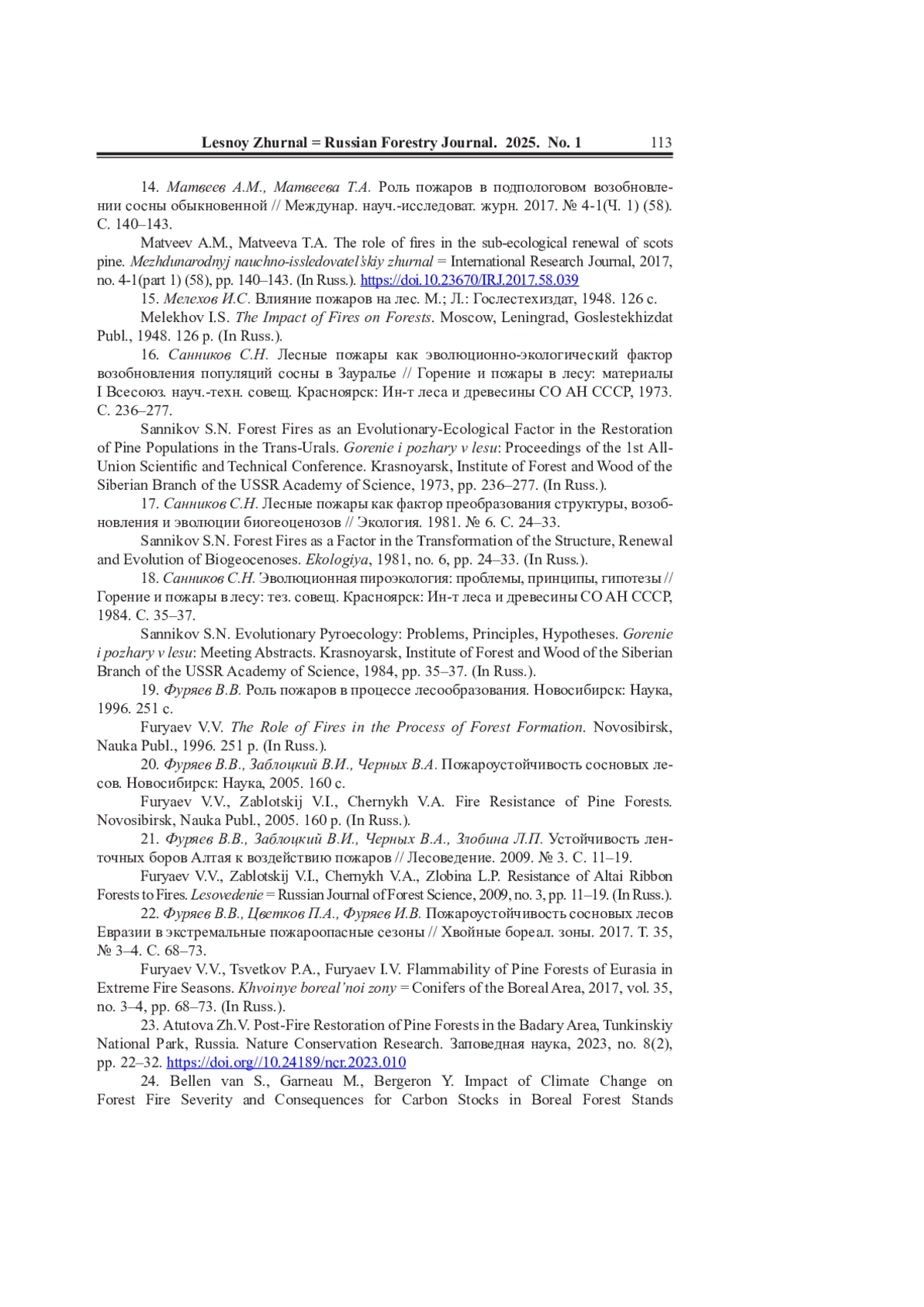 17. Санников С.Н. Лесные пожары как фактор преобразования структуры, возобновления и эволюции биогеоценозов // Экология. 1981. No 6. С. 24-33.