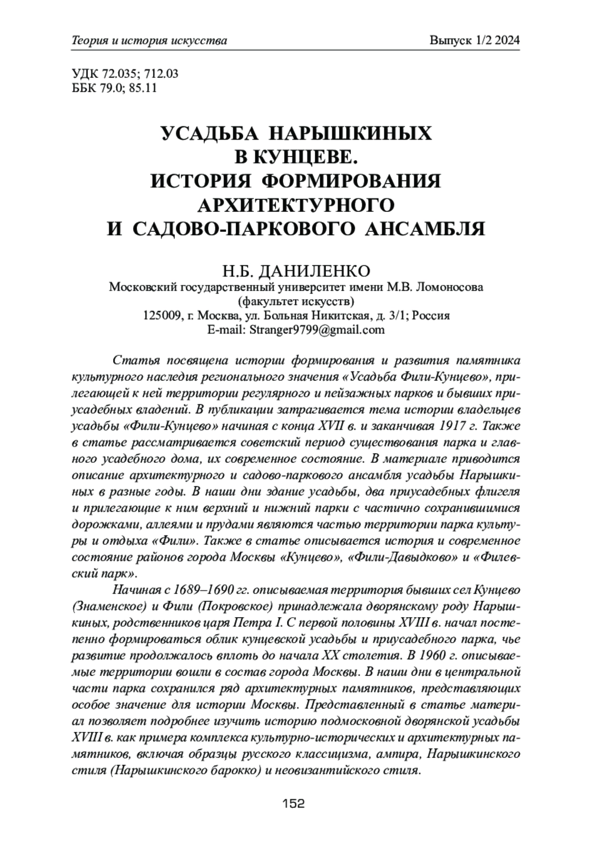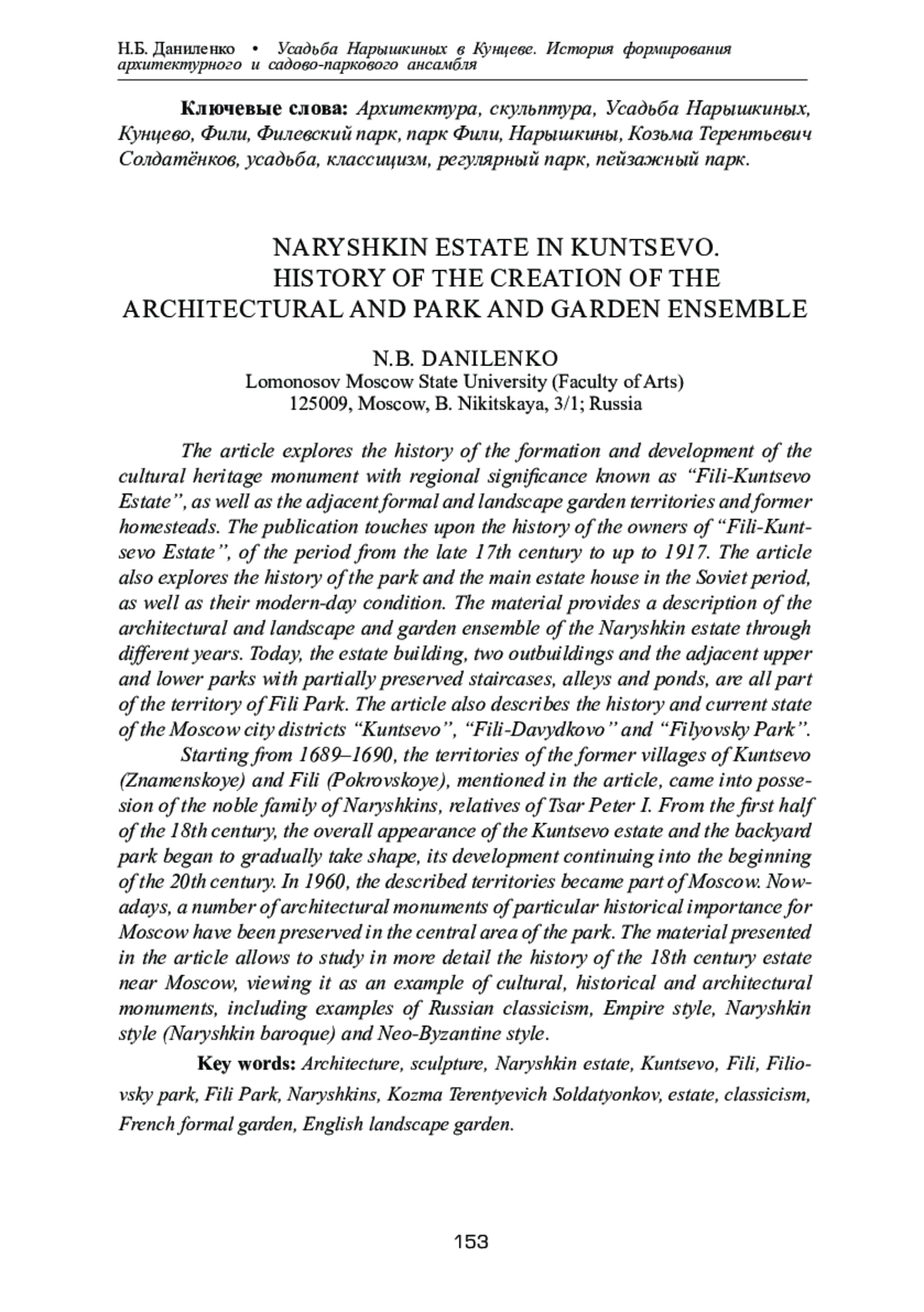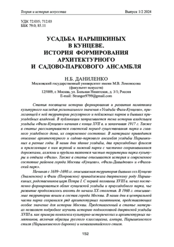 Статья посвящена истории формирования и развития памятника культурного наследия регионального значения «Усадьба Фили-Кунцево», прилегающей к ней территории регулярного и пейзажных парков и бывших приусадебных владений. В публикации затрагивается тема истории владельцев усадьбы «Фили-Кунцево» начиная с конца XVII в. и заканчивая 1917 г. Также в статье рассматривается советский период существования парка и главного усадебного дома, их современное состояние. В материале приводится описание архитектурного и садово-паркового ансамбля усадьбы Нарышкиных в разные годы. В наши дни здание усадьбы, два приусадебных флигеля и прилегающие к ним верхний и нижний парки с частично сохранившимися дорожками, аллеями и прудами являются частью территории парка культуры и отдыха «Фили». Также в статье описывается история и современное состояние районов города Москвы «Кунцево», «Фили-Давыдково» и «Филевский парк». Начиная с 1689–1690 гг. описываемая территория бывших сел Кунцево (Знаменское) и Фили (Покровское) принадлежала дворянскому роду Нарышкиных, родственников царя Петра I. С первой половины XVIII в. начал постепенно формироваться облик кунцевской усадьбы и приусадебного парка, чье развитие продолжалось вплоть до начала XX столетия. В 1960 г. описываемые территории вошли в состав города Москвы. В наши дни в центральной части парка сохранился ряд архитектурных памятников, представляющих особое значение для истории Москвы. Представленный в статье материал позволяет подробнее изучить историю подмосковной дворянской усадьбы XVIII в. как примера комплекса культурно-исторических и архитектурных памятников, включая образцы русского классицизма, ампира, Нарышкинского стиля (Нарышкинского барокко) и неовизантийского стиля