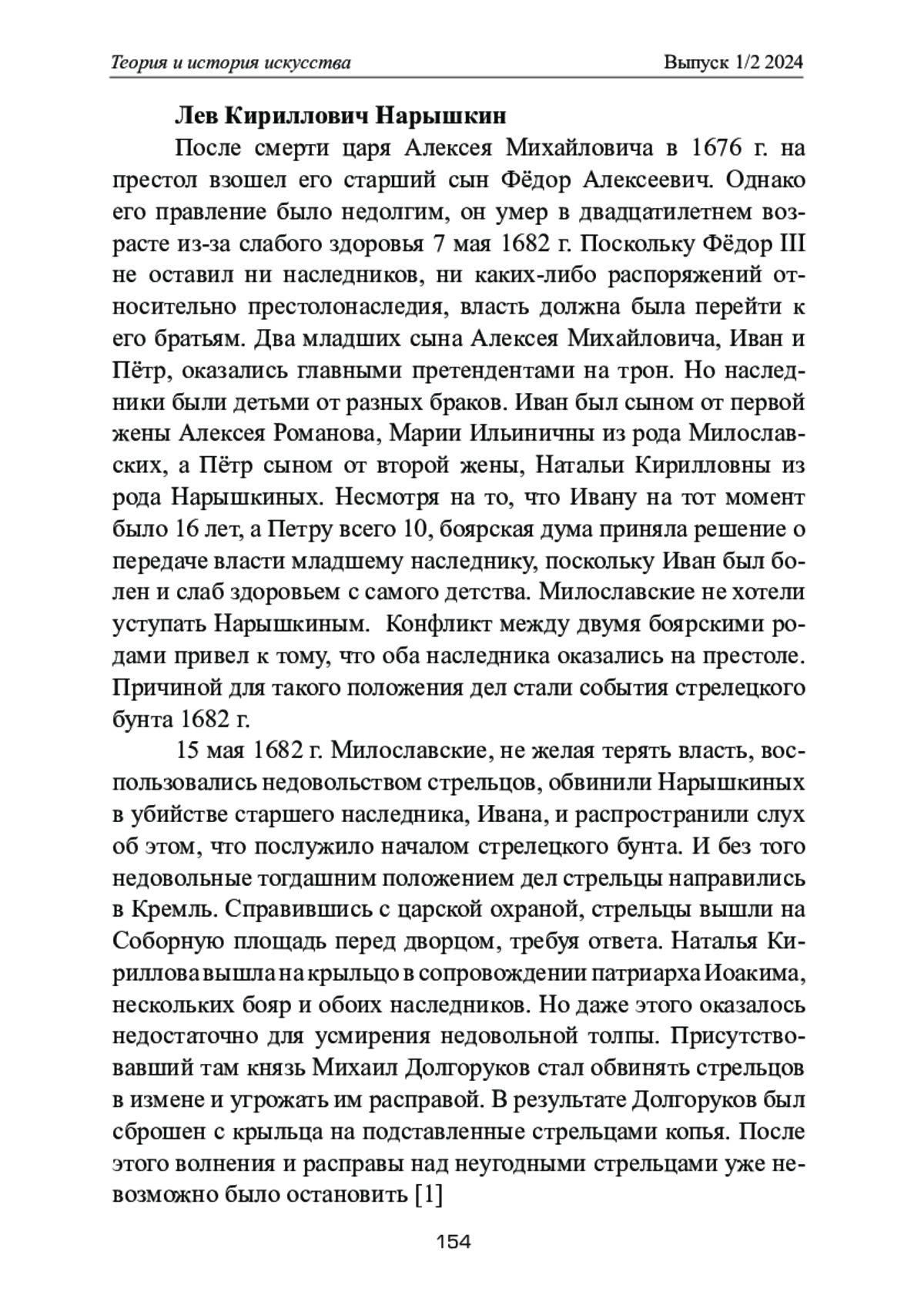 После смерти царя Алексея Михайловича в 1676 г. на престол взошел его старший сын Фёдор Алексеевич. Однако его правление было недолгим, он умер в двадцатилетнем возрасте из-за слабого здоровья 7 мая 1682 г. Поскольку Фёдор III не оставил ни наследников, ни каких-либо распоряжений относительно престолонаследия, власть должна была перейти к его братьям. Два младших сына Алексея Михайловича, Иван и Пётр, оказались главными претендентами на трон. Но наследники были детьми от разных браков.
