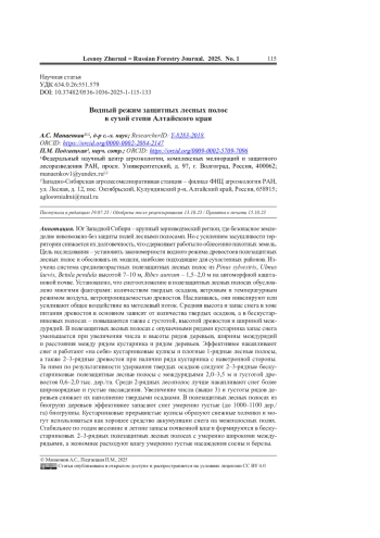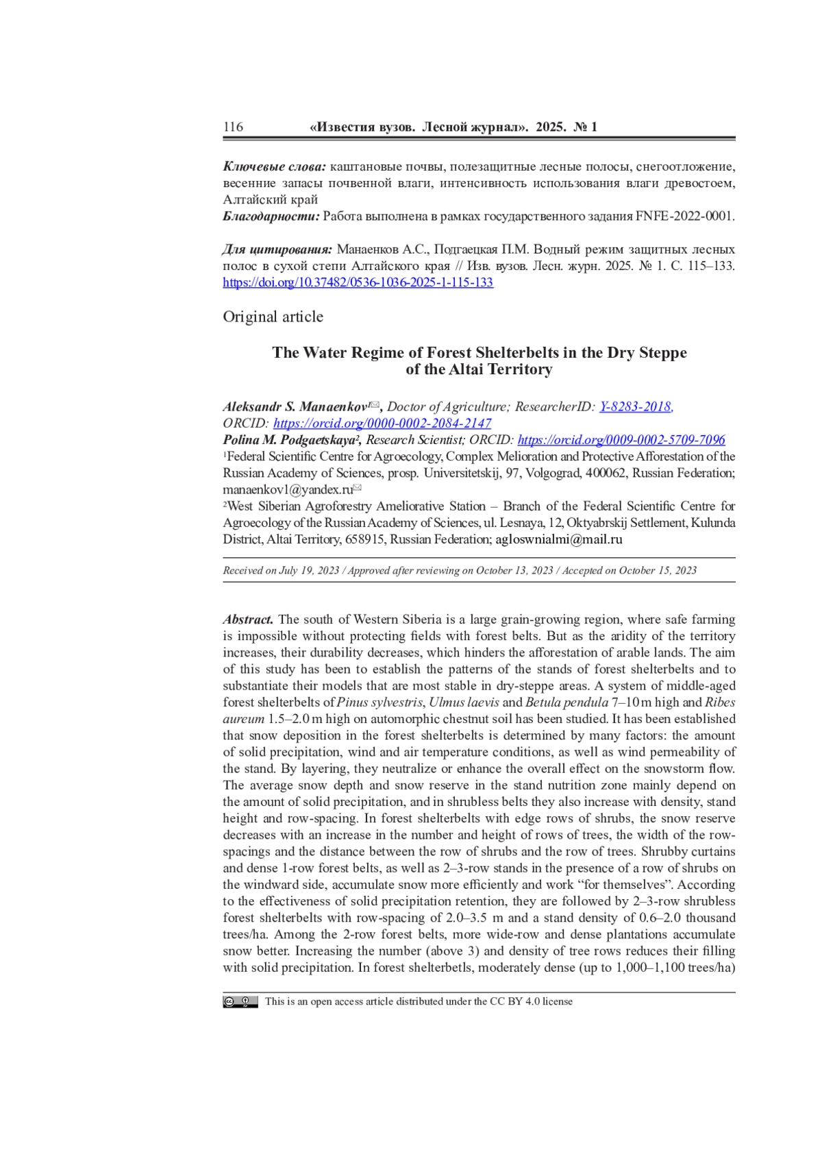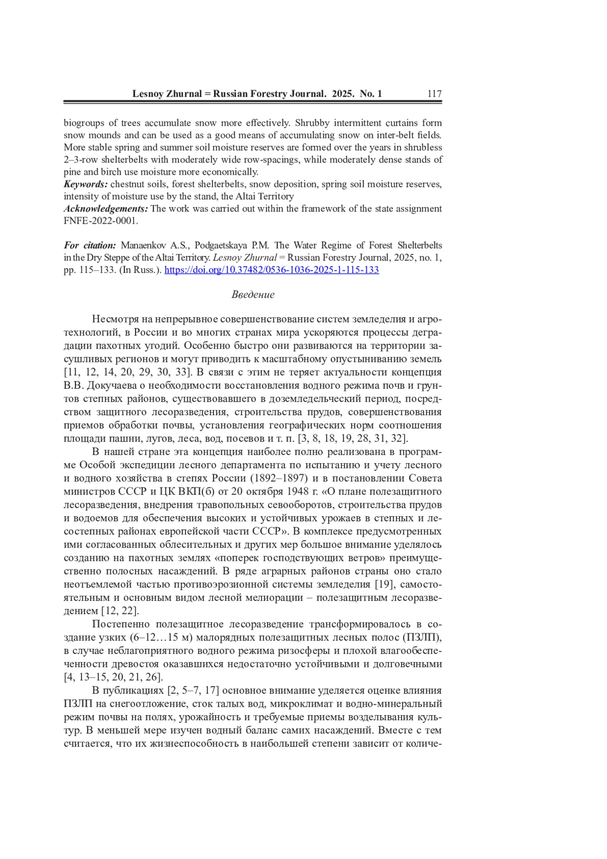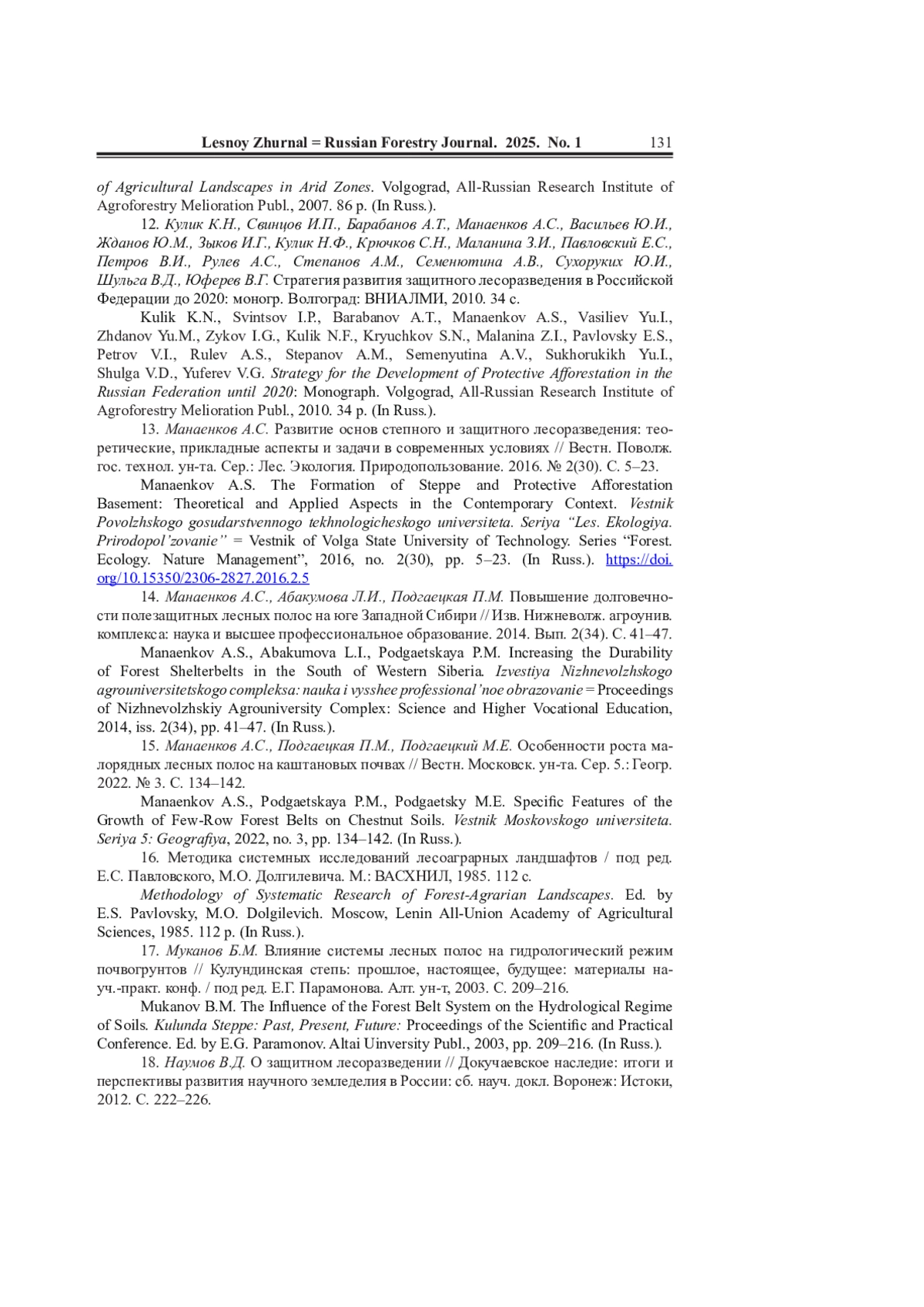 15. Манаенков А.С., Подгаецкая П.М., Подгаецкий М.Е. Особенности роста малорядных лесных полос на каштановых почвах // Вестн. Московск. ун-та. Сер. 5.: Геогр. 2022. No 3. С. 134-142. EDN: VWPCHA