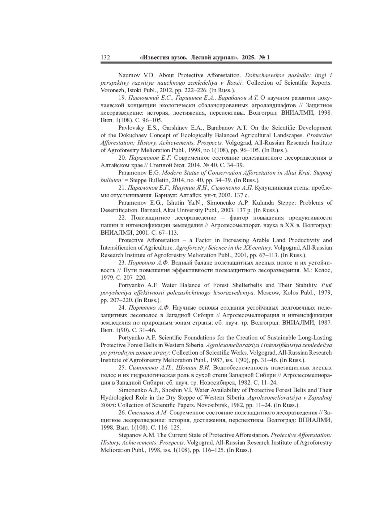 23. Портянко А.Ф. Водный баланс полезащитных лесных полос и их устойчивость // Пути повышения эффективности полезащитного лесоразведения. М.: Колос, 1979. С. 207-220.