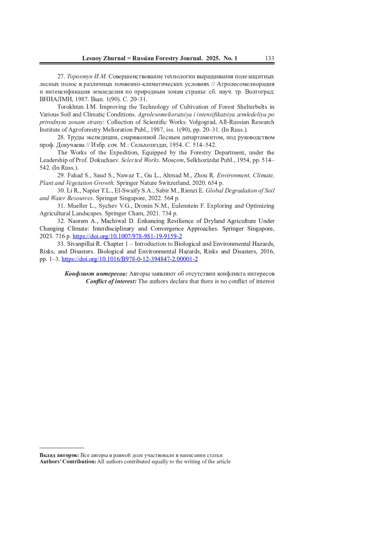 27. Торохтун И.М. Совершенствование технологии выращивания полезащитных лесных полос в различных почвенно-климатических условиях // Агролесомелиорация и интенсификация земледелия по природным зонам страны: сб. науч. тр. Волгоград: ВНИАЛМИ, 1987. Вып. 1 (90). С. 20-31.